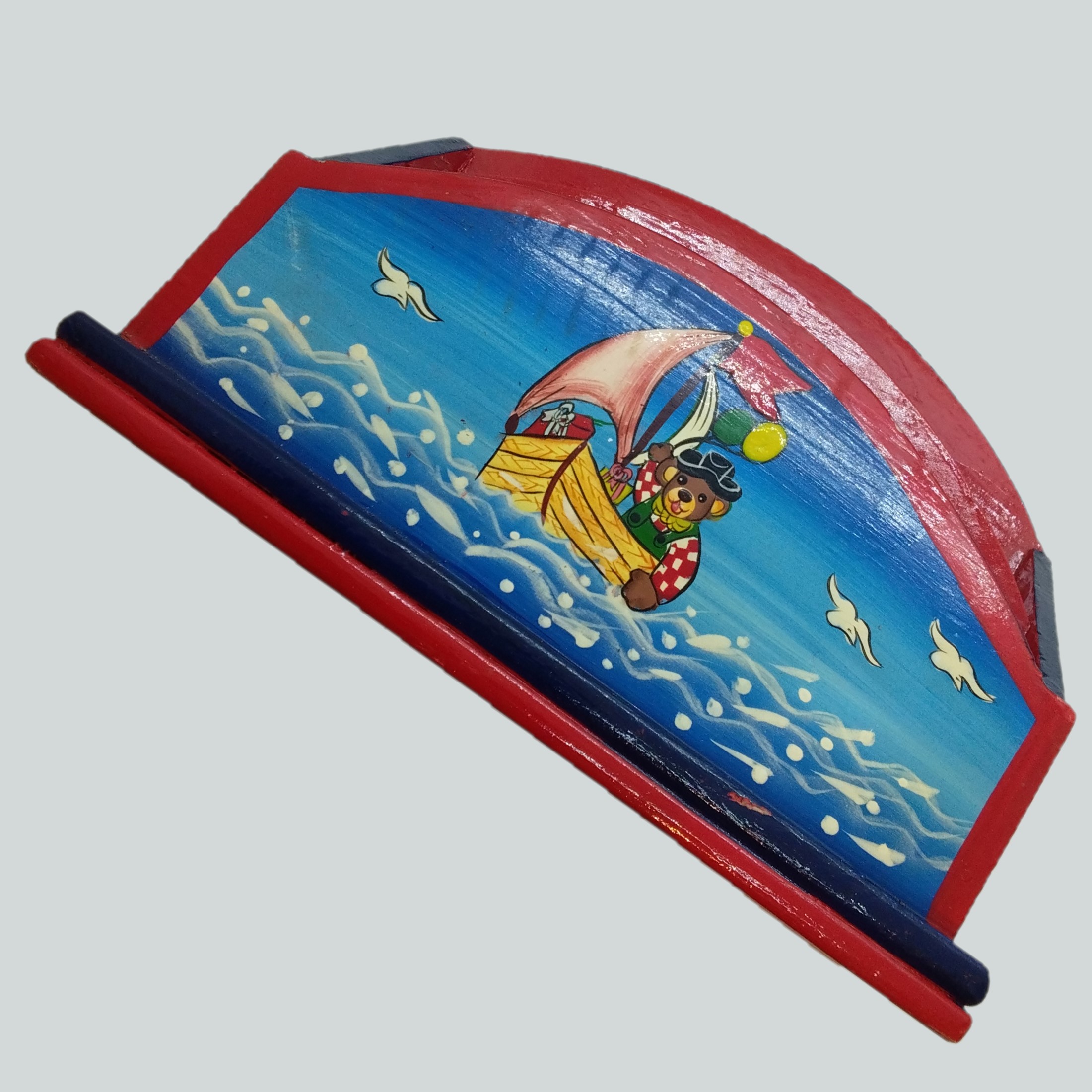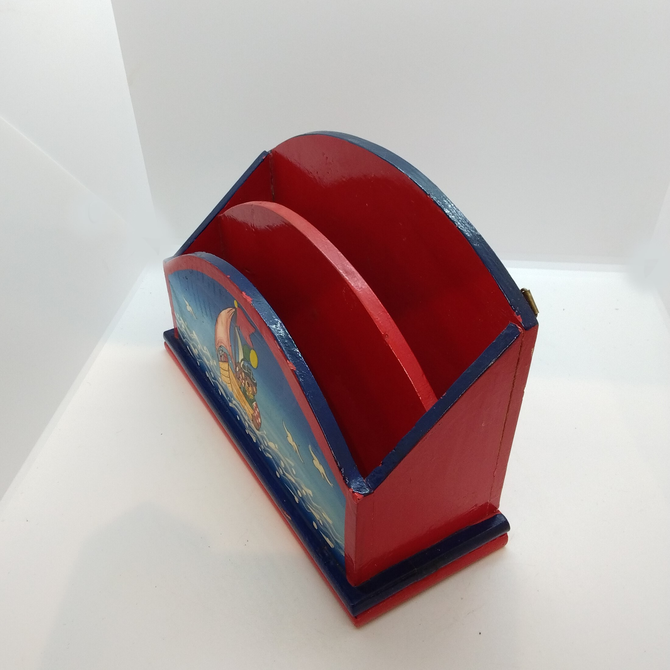 Trevlig brev/pappershållare i trä målad med barnmotiv. Mått ca 25*18*9 cm, två fack.