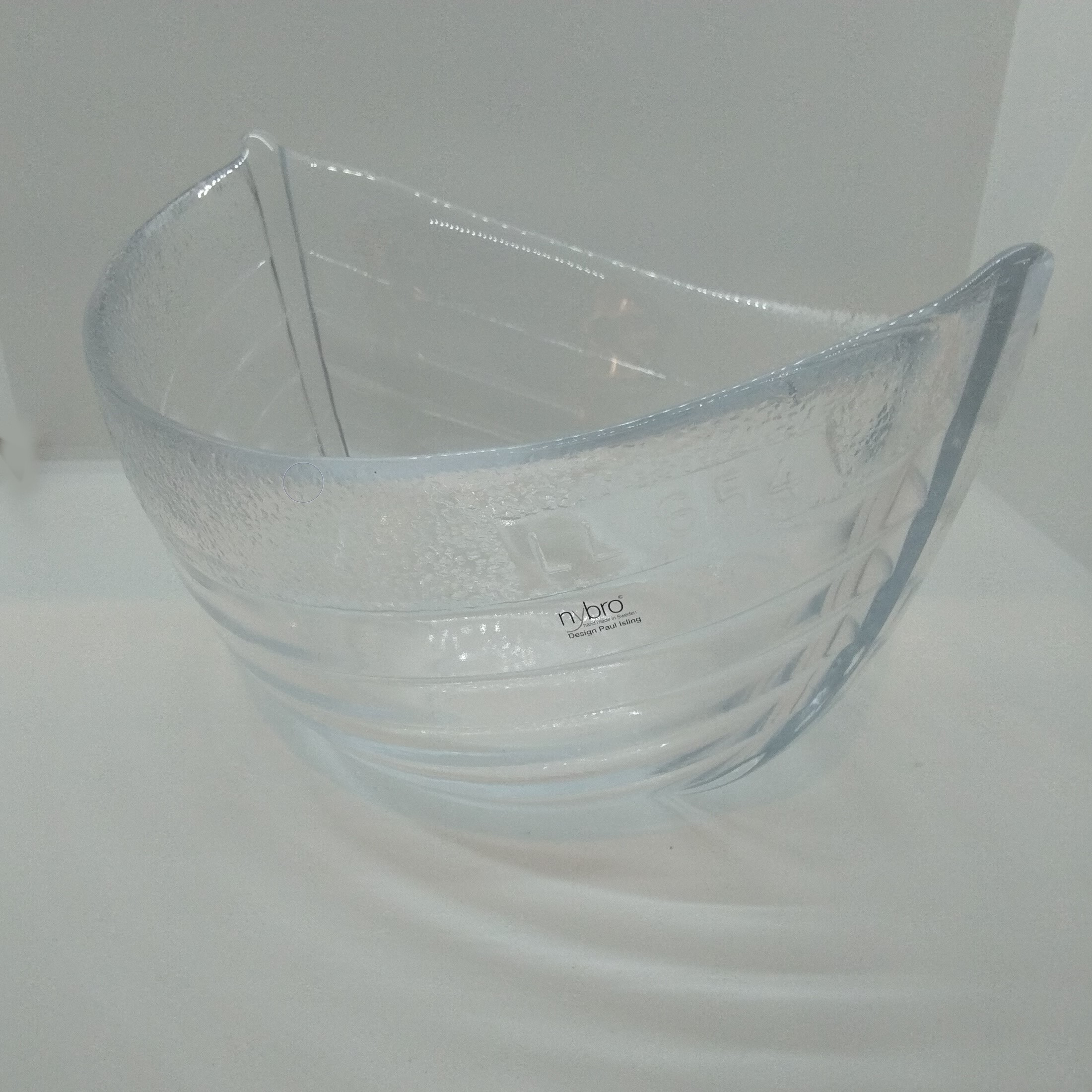 Båtformad glasskål från Nybro Glasbruk. Bohus design Paul Isling, etikettmärkt, längd 24 cm, bredd 20 cm, höjd 14 cm – felfri! (Nypris ca 300:-)
