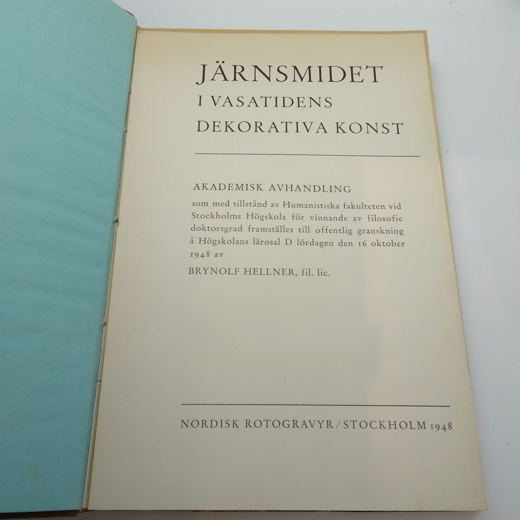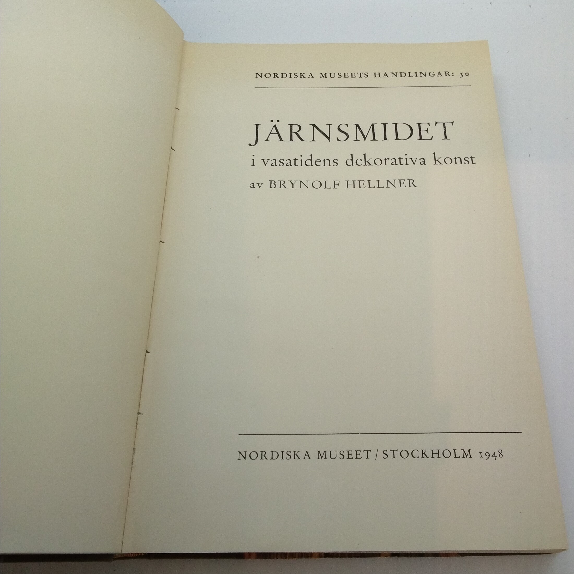 Järnsmidet i vasatidens dekorativa konst, Nordiska Museets Handlingar:30, Brynolf Hellner . Akademisk avhandling i Stockholm 1948, halvfranskt band, mycket bra skick även om någon sida lossnat – mycket ovanlig!