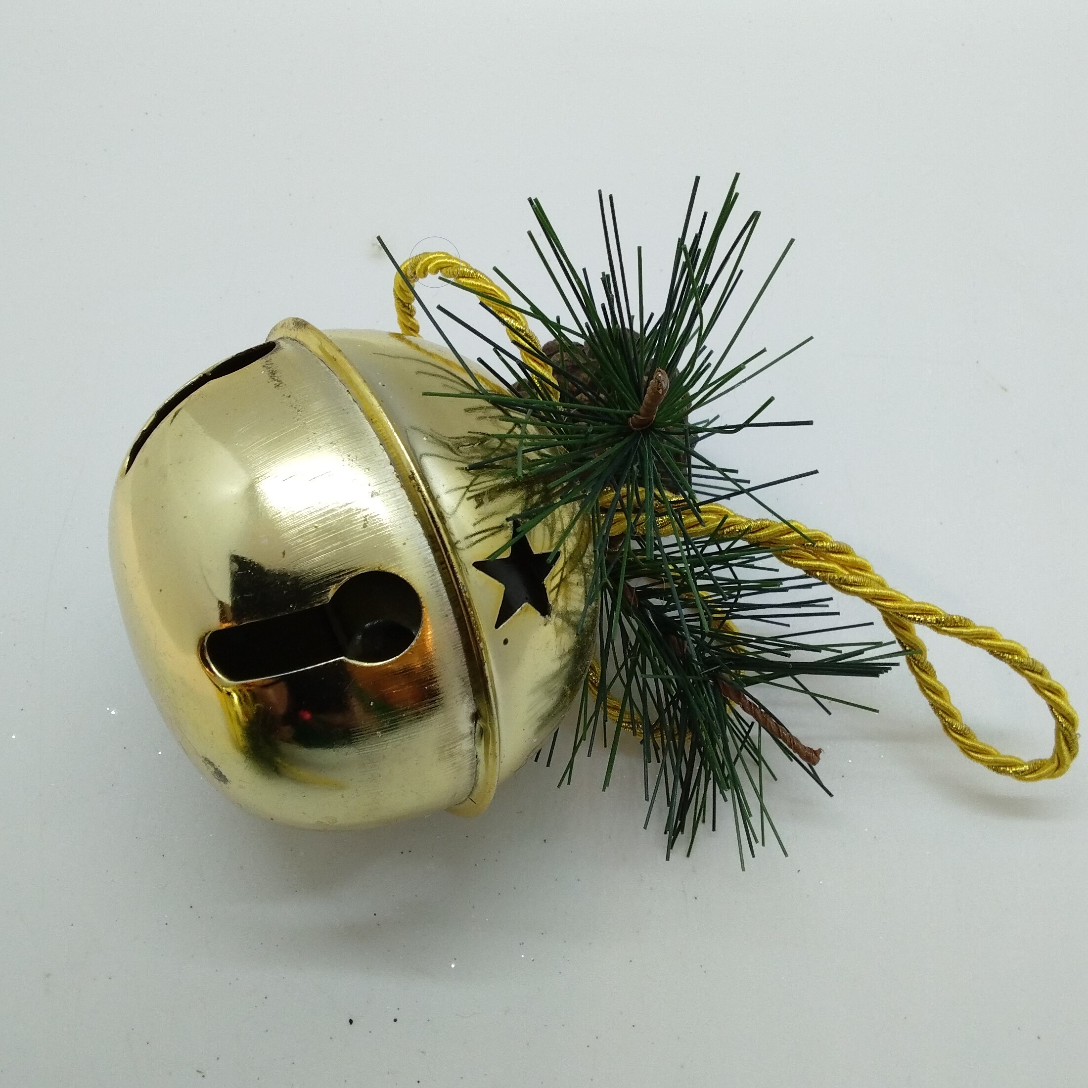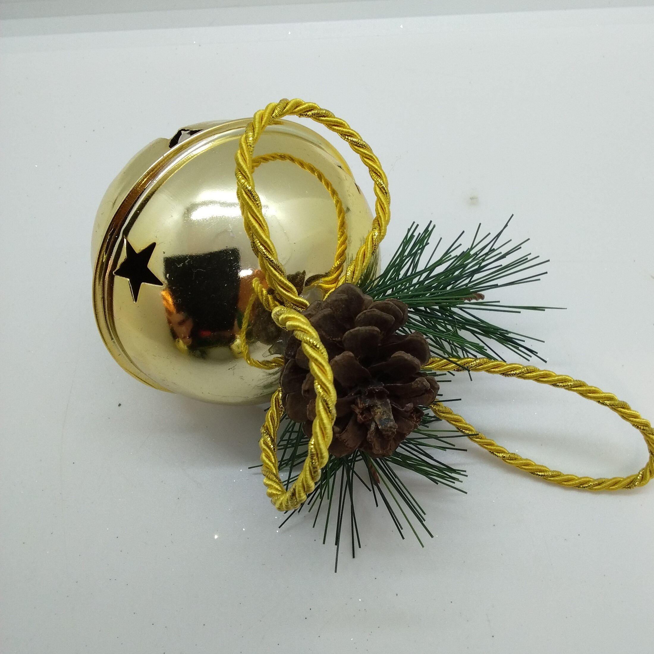 Tre st bjällror i mässing, ø 9 cm, dekoration med gran och kotte