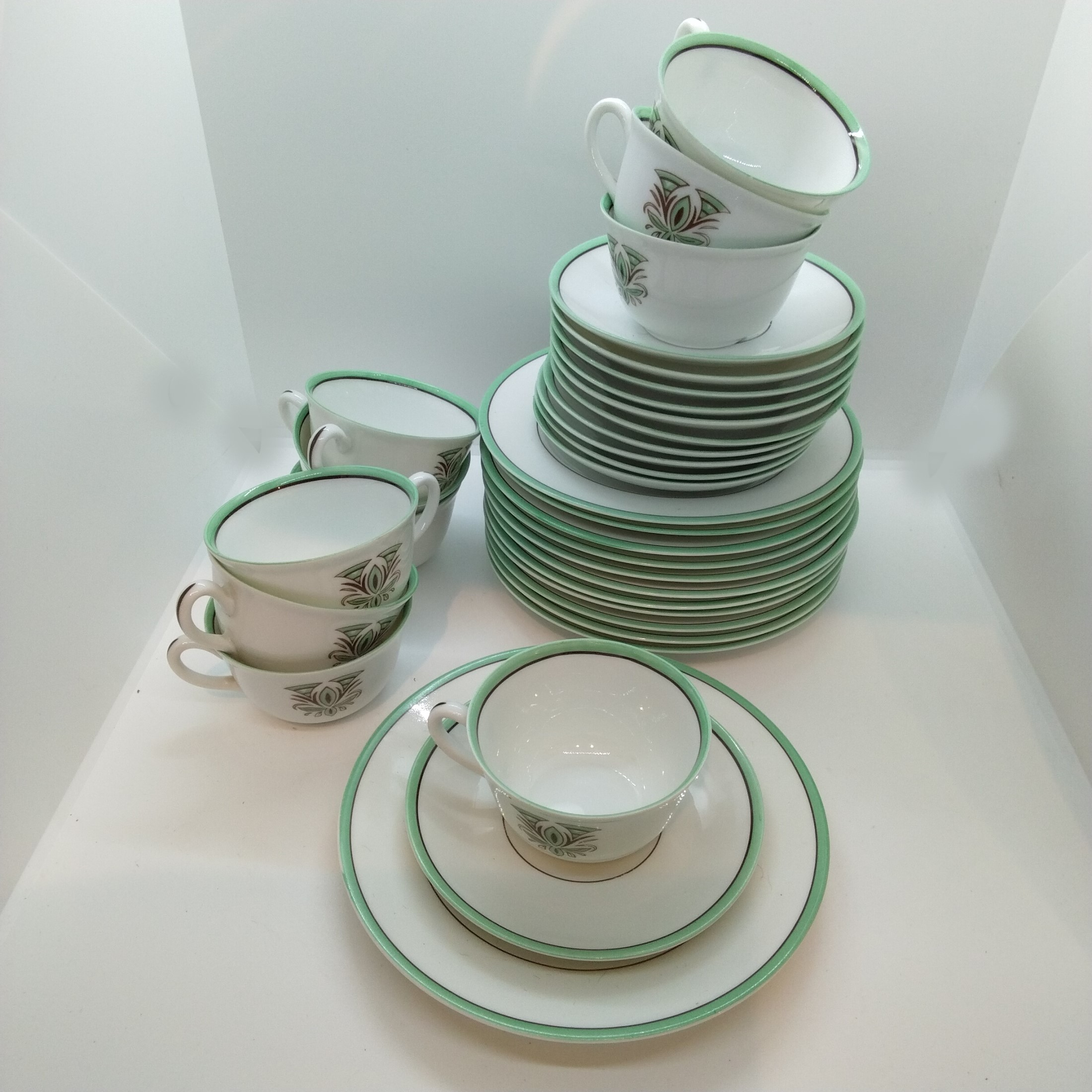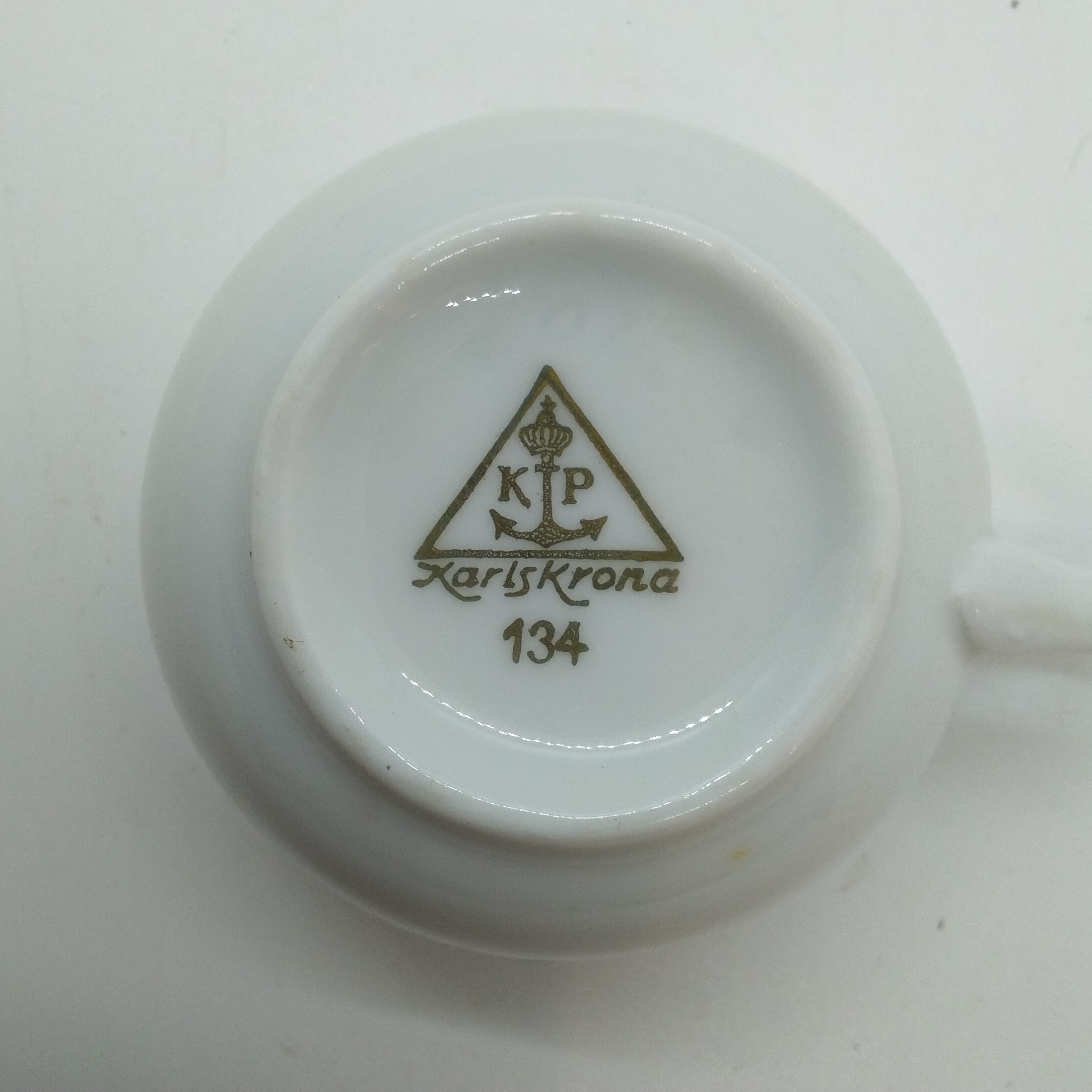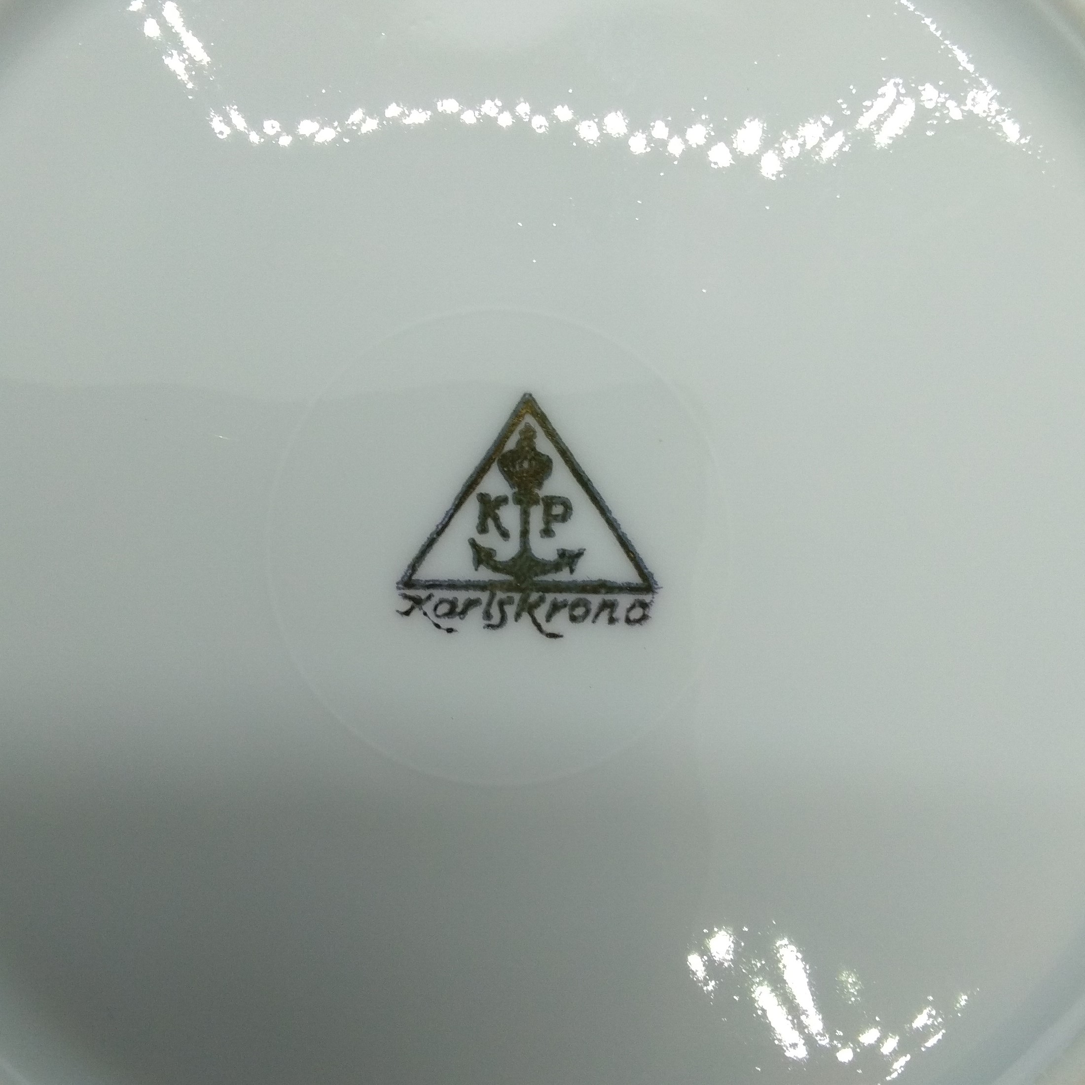 Kaffekoppar med assietter från Karlskrona porslinsfabrik. Det finns 11 fat (ø 13 cm), 10 koppar (ø 10 cm) och 11 assietter (ø 18 cm), kopp och fat höjd 6 cm. Helt felfria utan naggar, ngt lite dekorslitage.