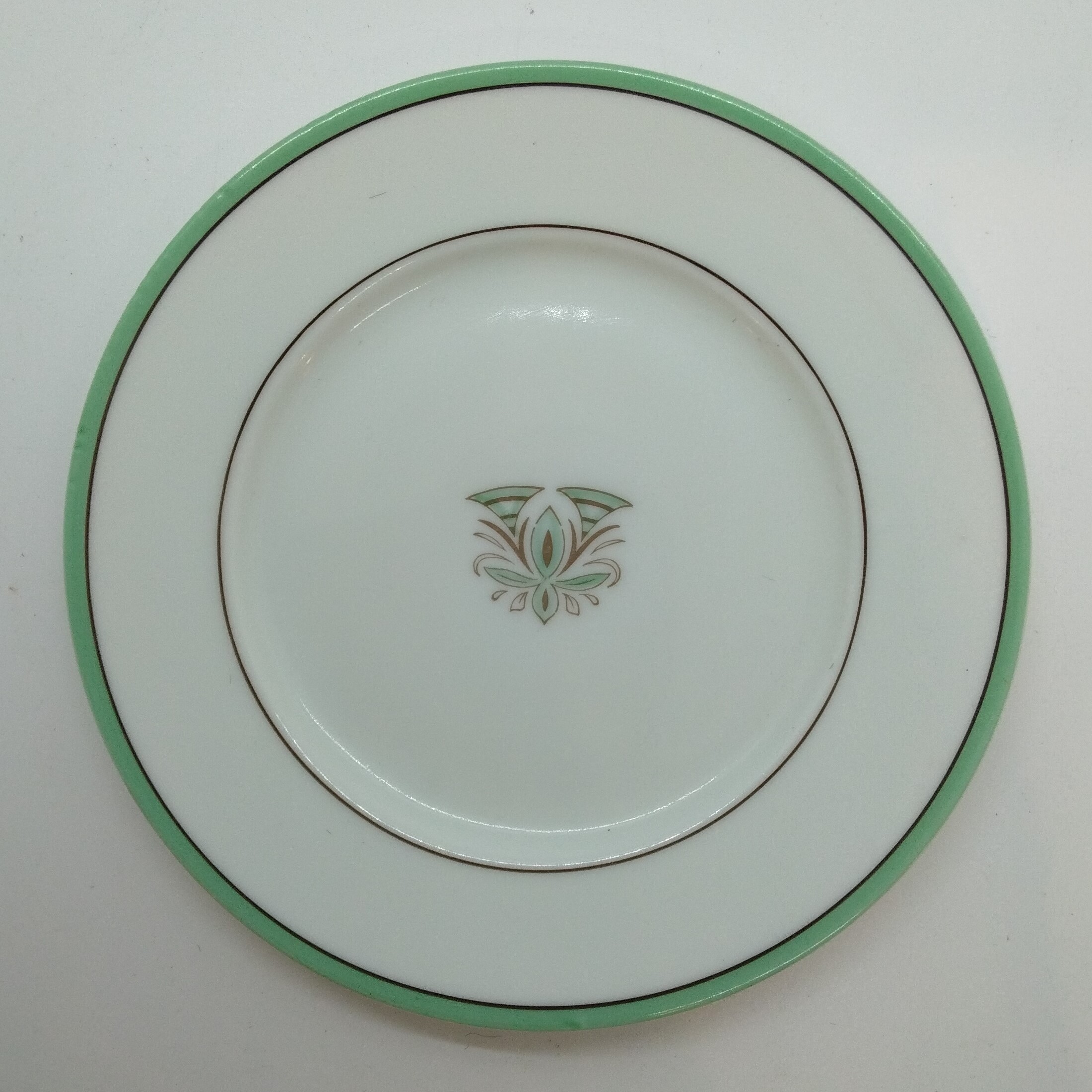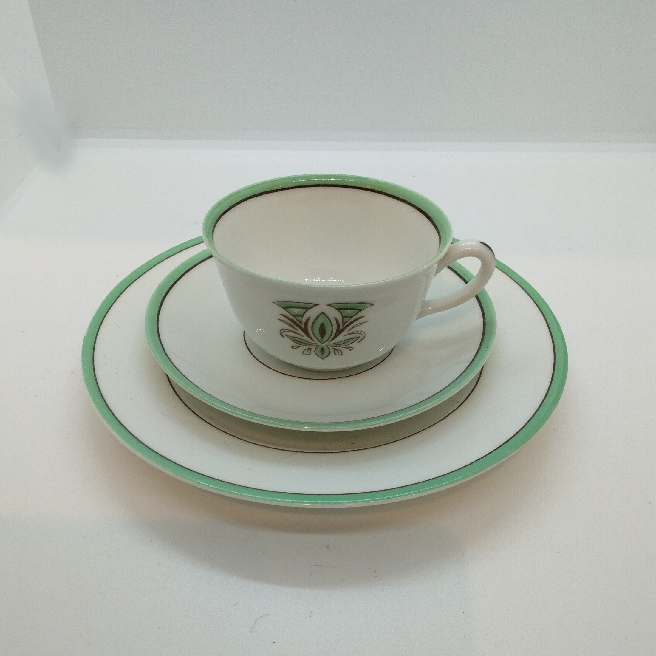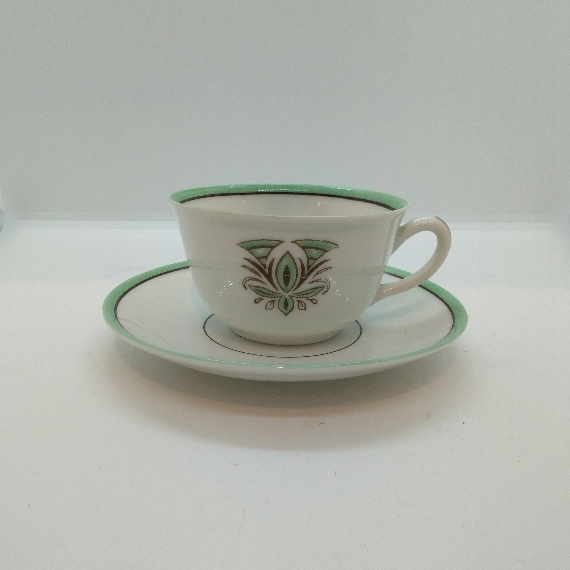 Kaffekoppar med assietter från Karlskrona porslinsfabrik. Det finns 11 fat (ø 13 cm), 10 koppar (ø 10 cm) och 11 assietter (ø 18 cm), kopp och fat höjd 6 cm. Helt felfria utan naggar, ngt lite dekorslitage.
