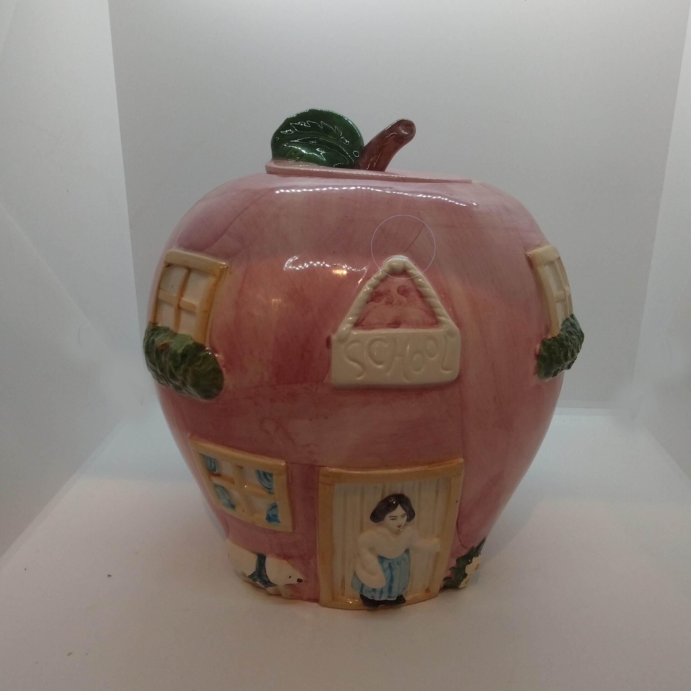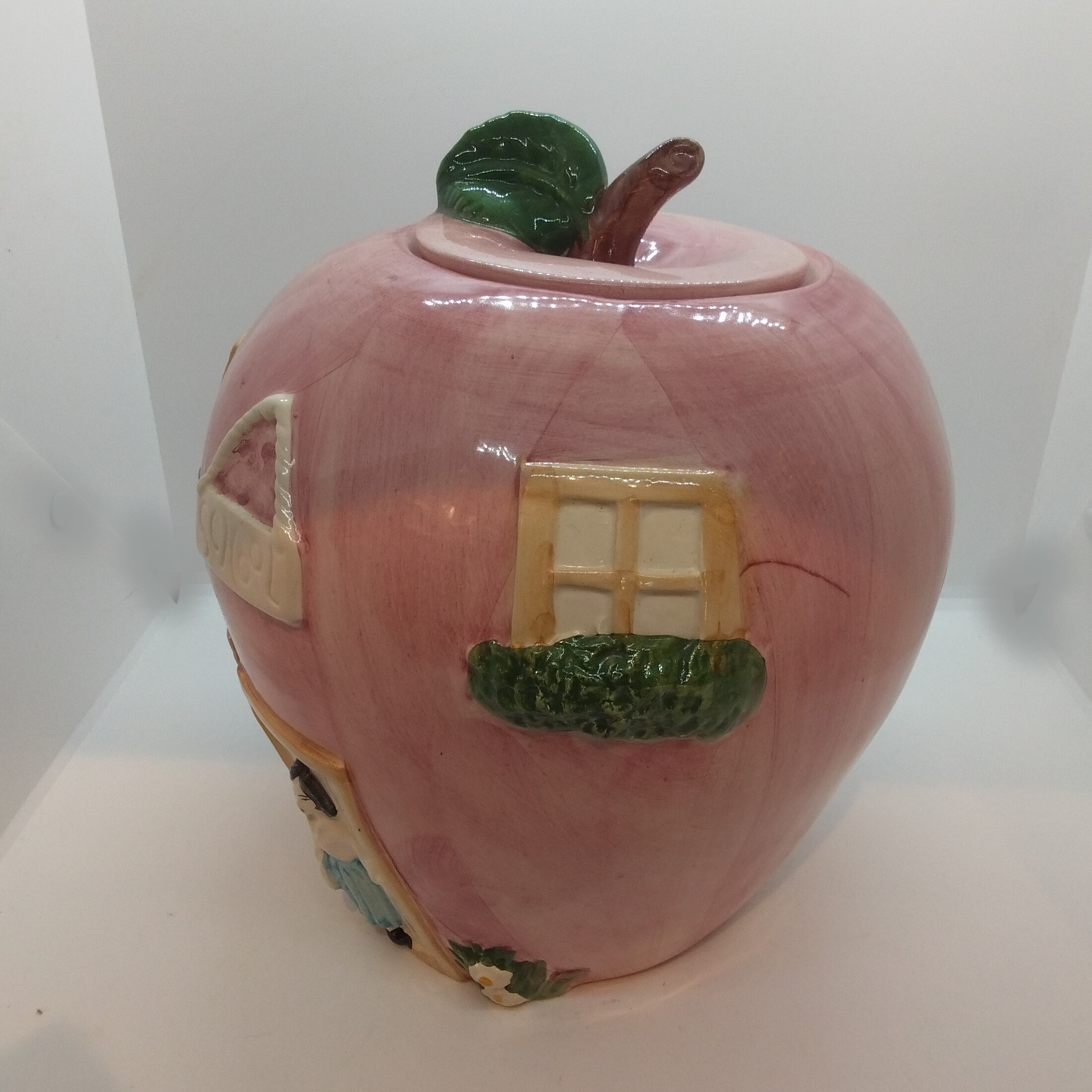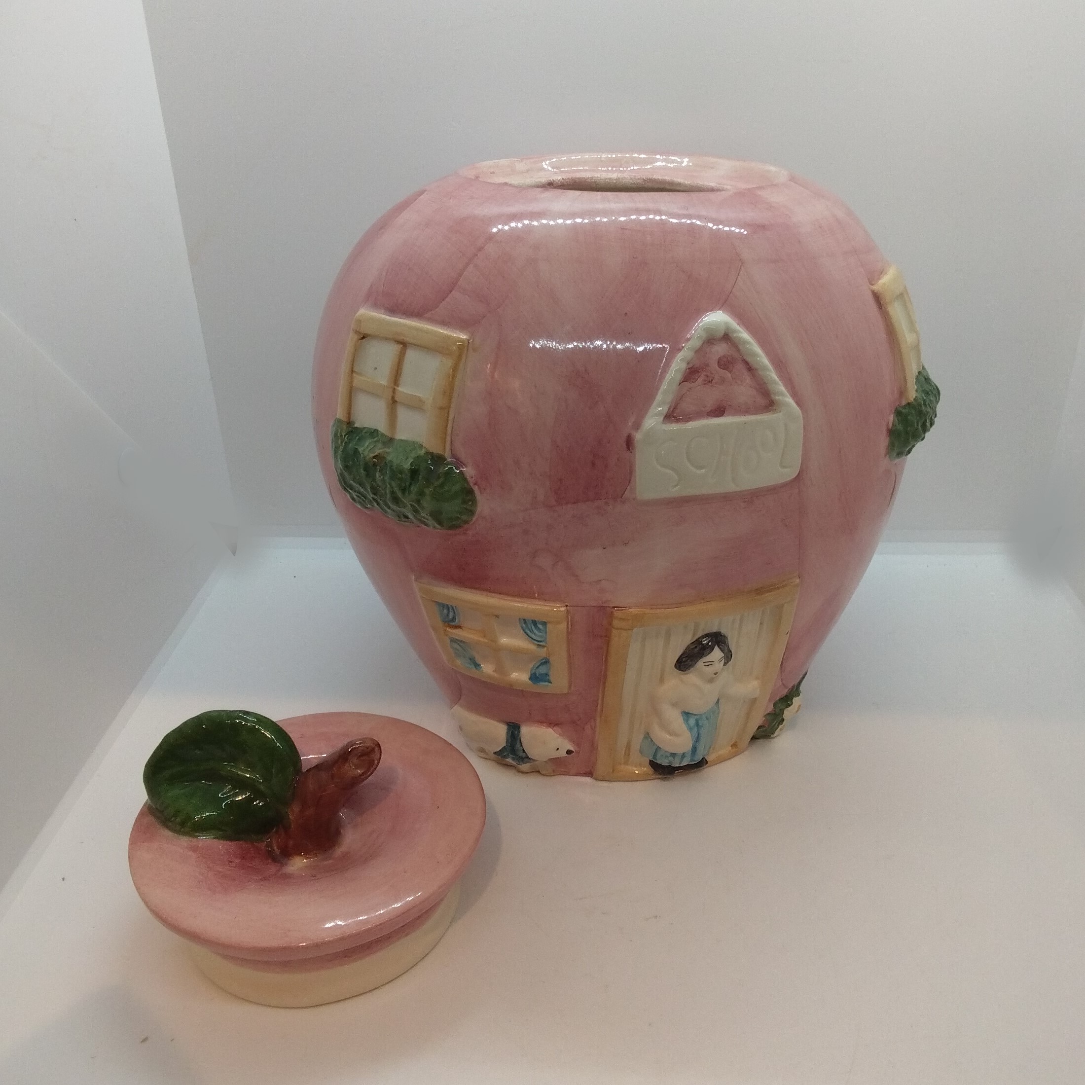Stor målad kakburk med lock i fajans, ”school”, höjd 23 cm, ø 23 cm, felfri!