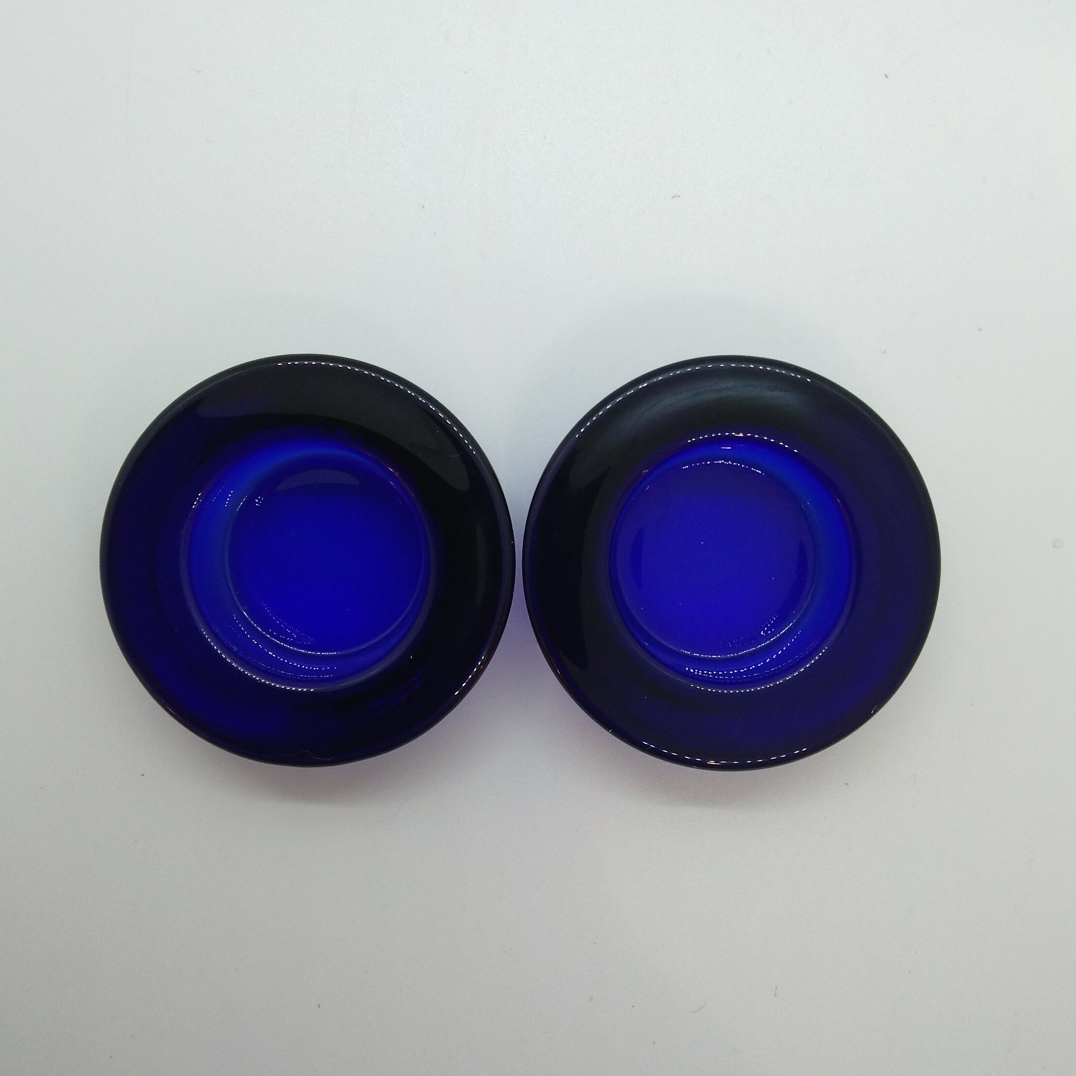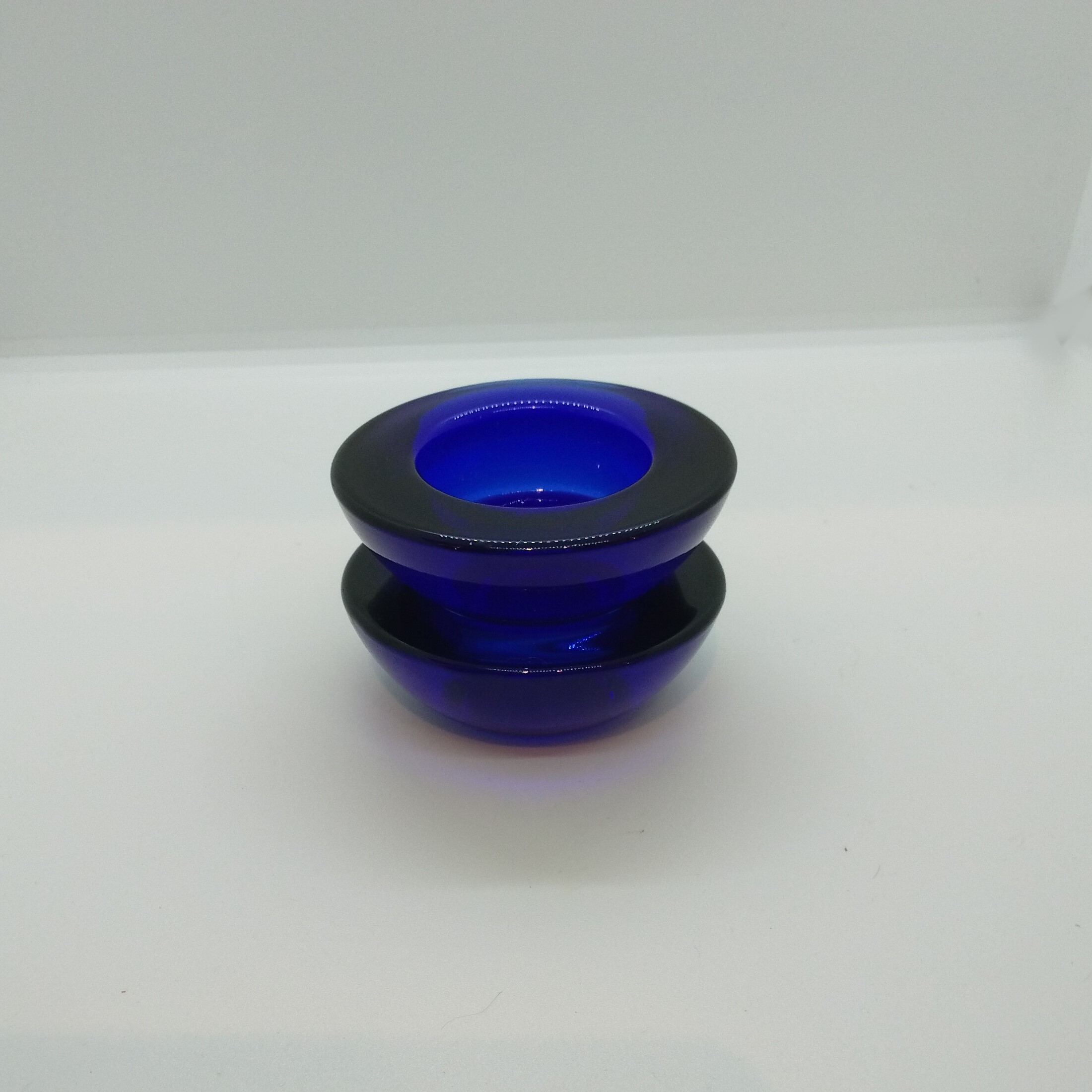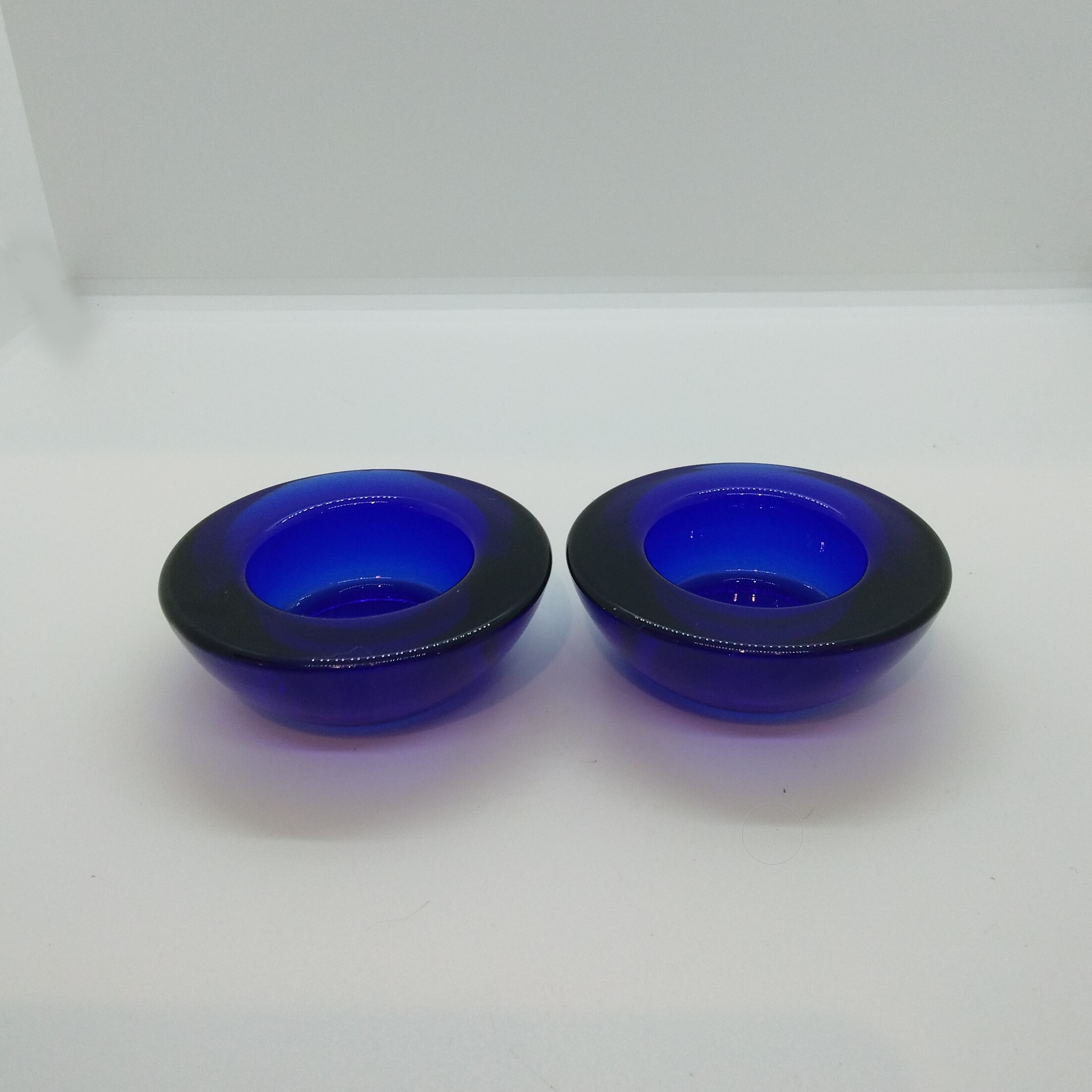 Ljushållare för värmeljus i blått glas, märkta ”15”, 20:-/par