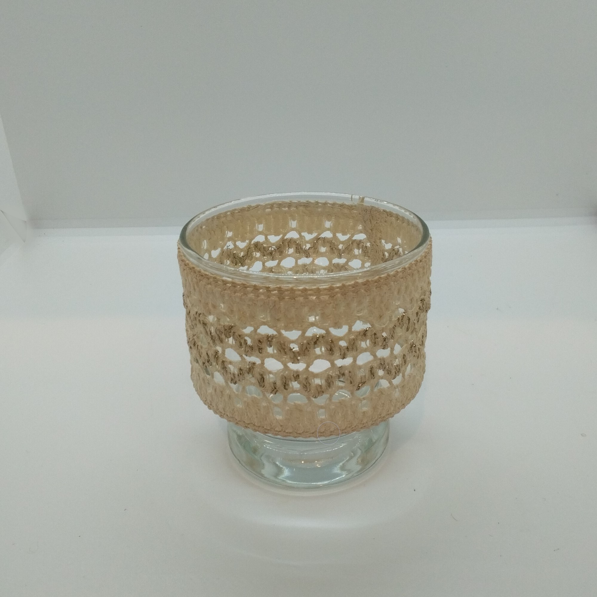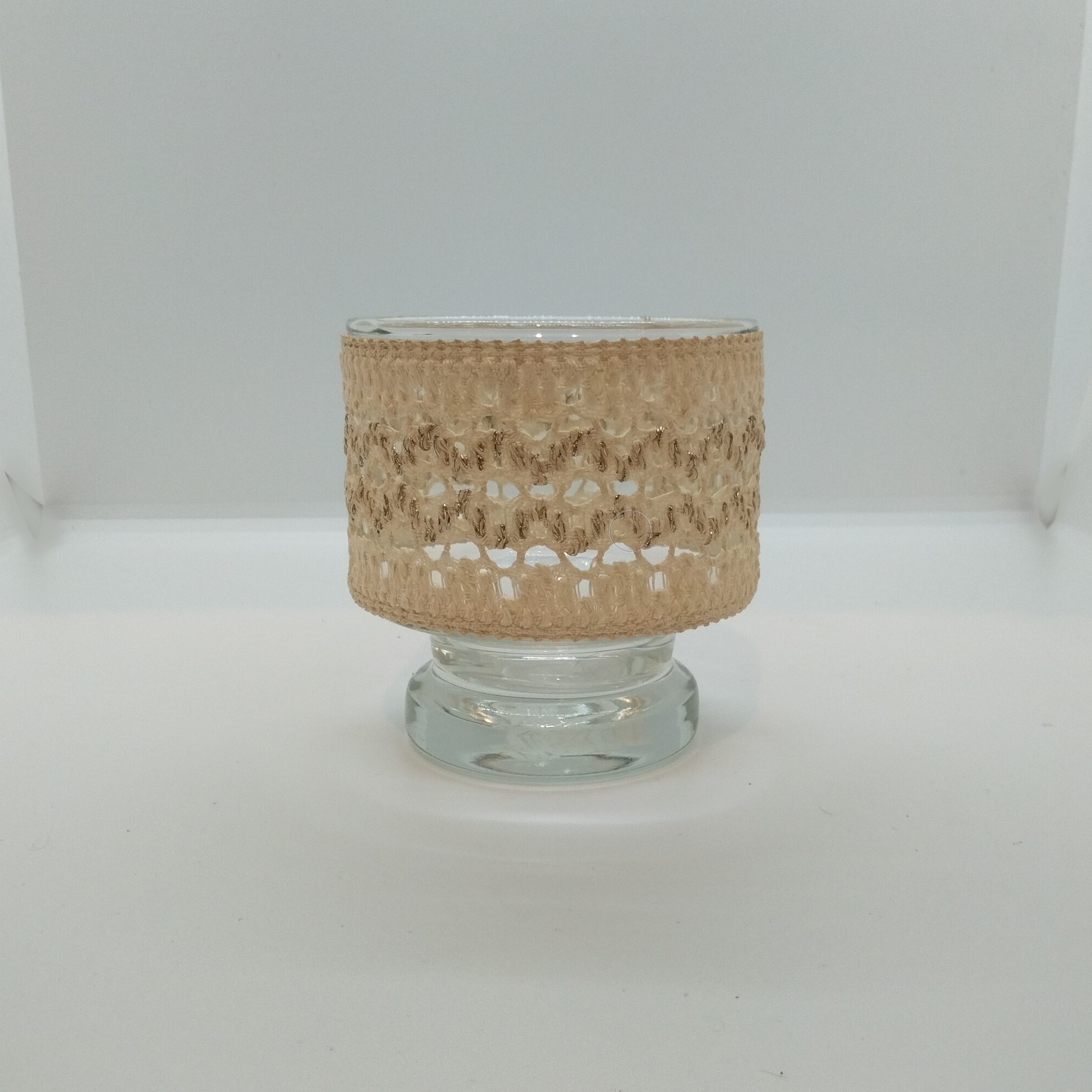 Ljuslykta med ”frivola” inslag. Frivoliteter, knypplat eller något annat avancerat handarbete – hur som helst ett behagligt sken med tänt värmeljus. Höjd ca 9 cm, ø 8,5 cm, felfri!