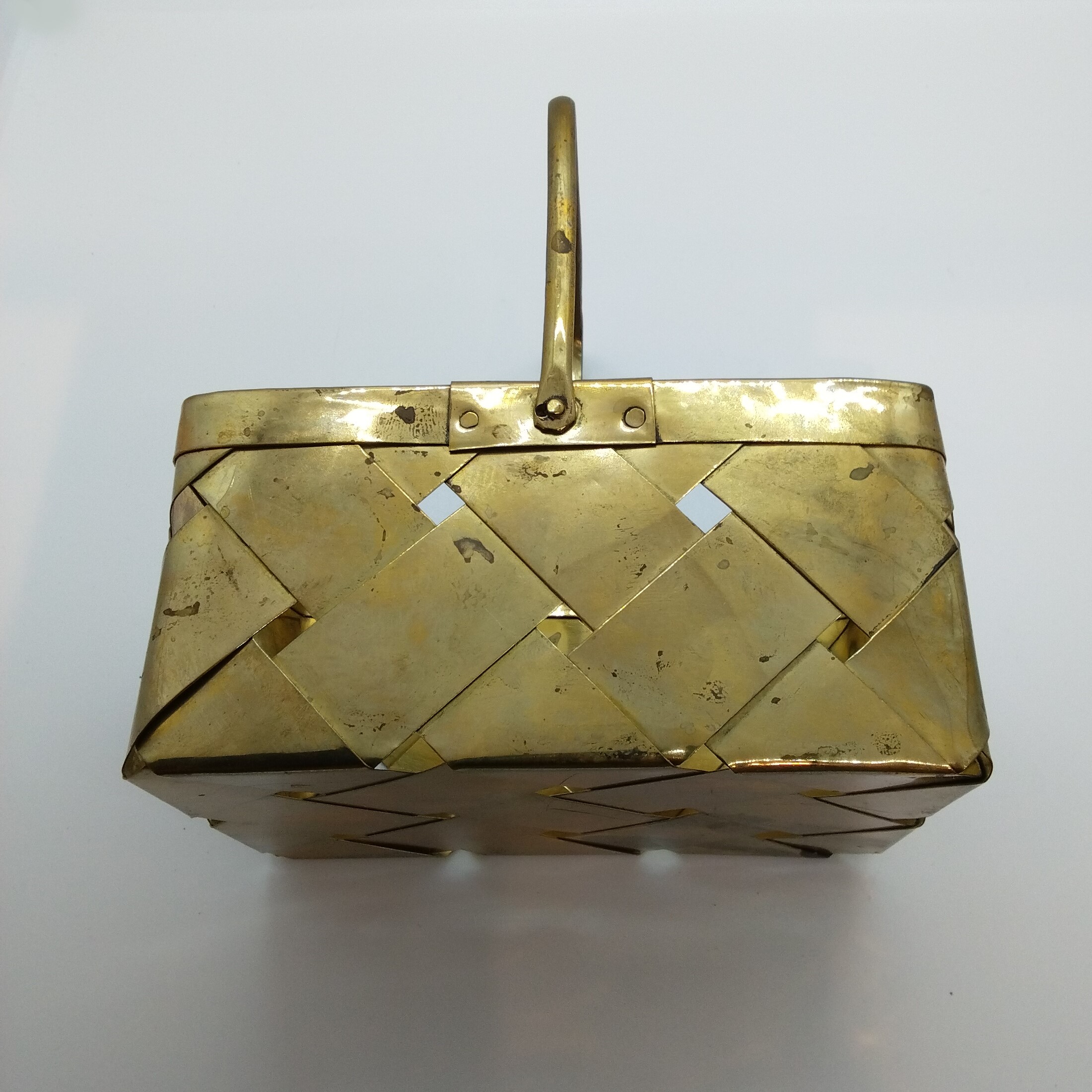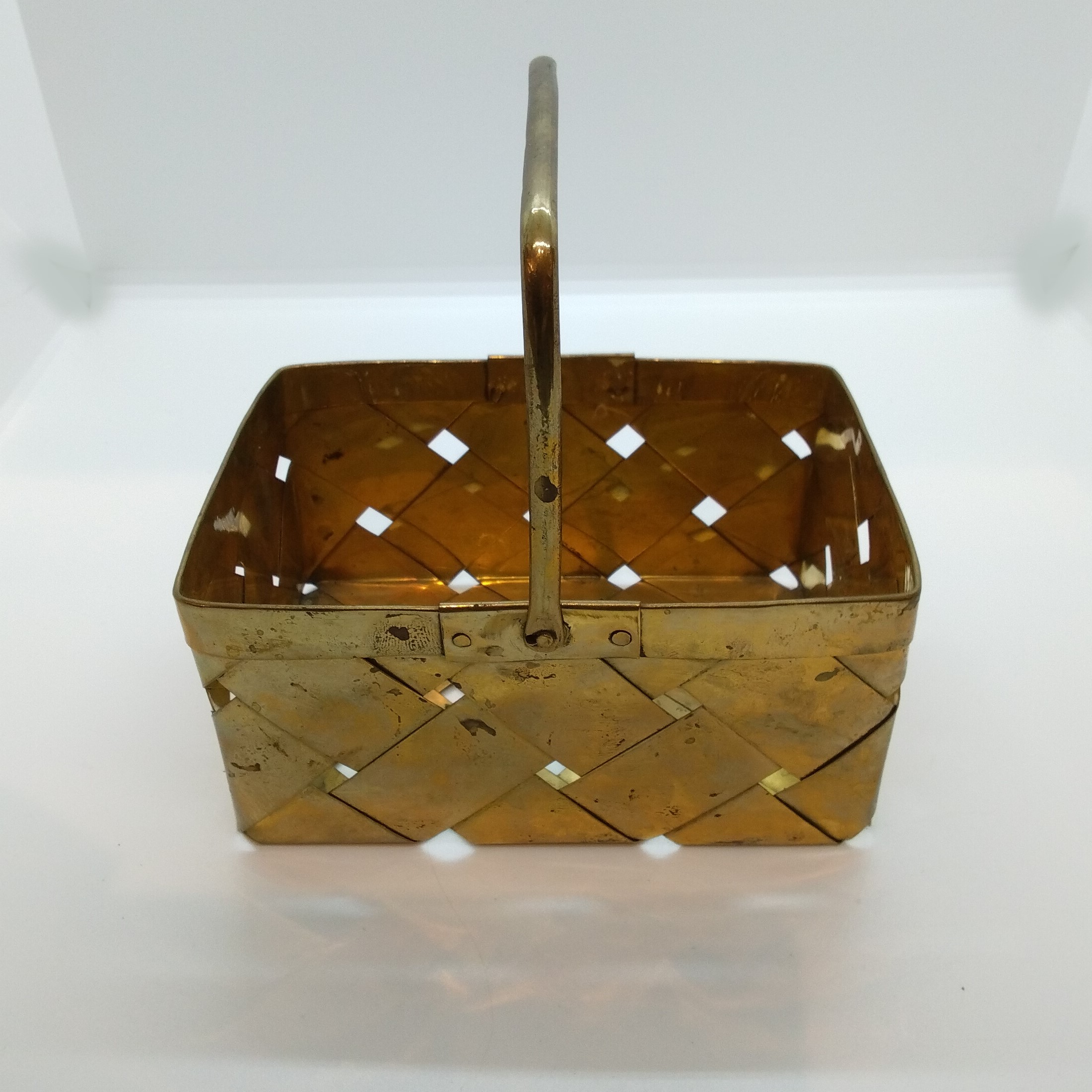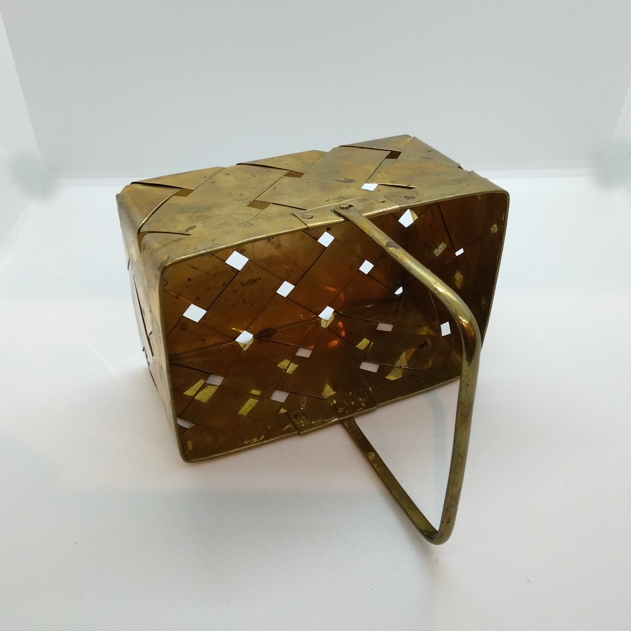 Korg i mässing, ”flätad”, längd ca 14 cm, höjd ca 14 cm (med handtag), bredd ca 10 cm.