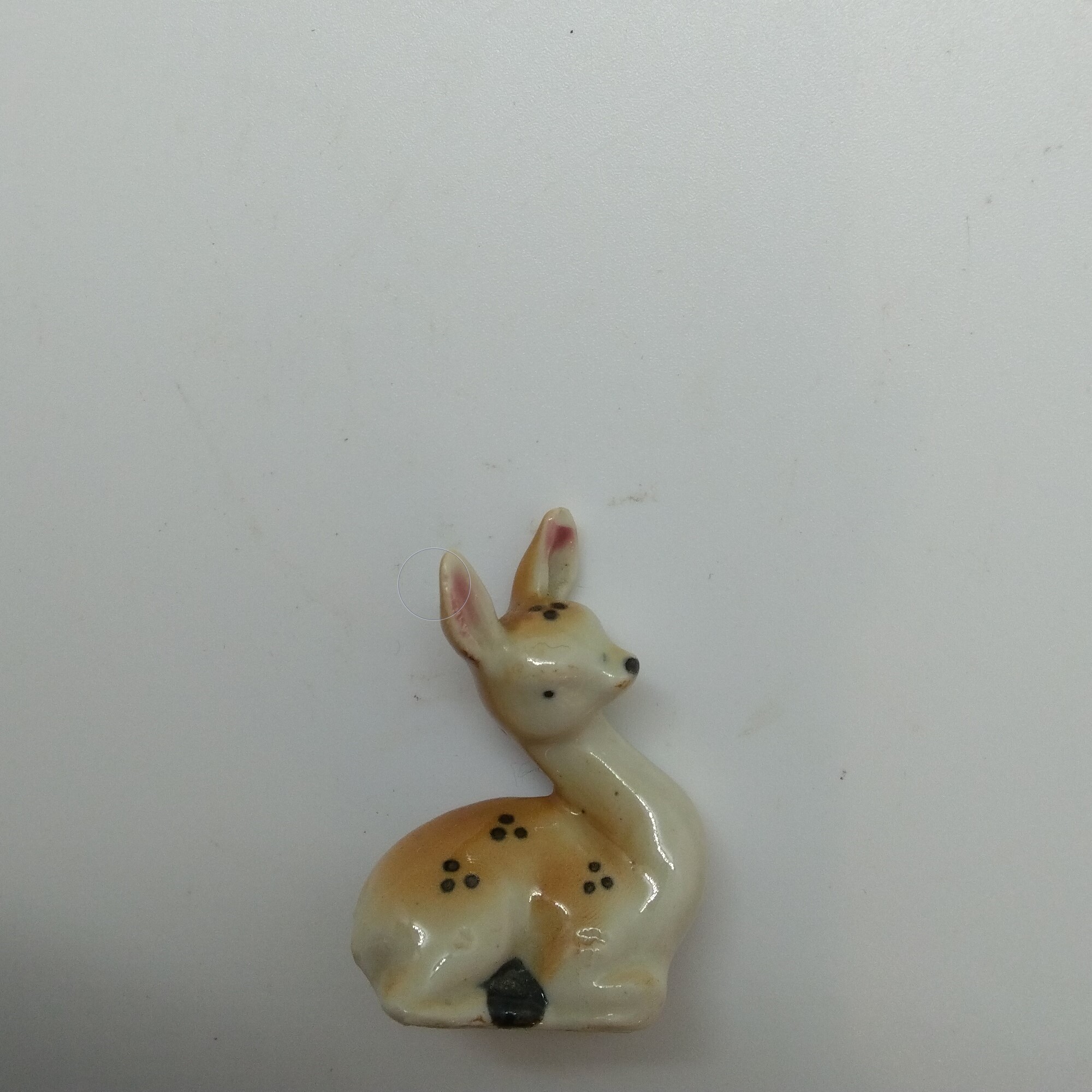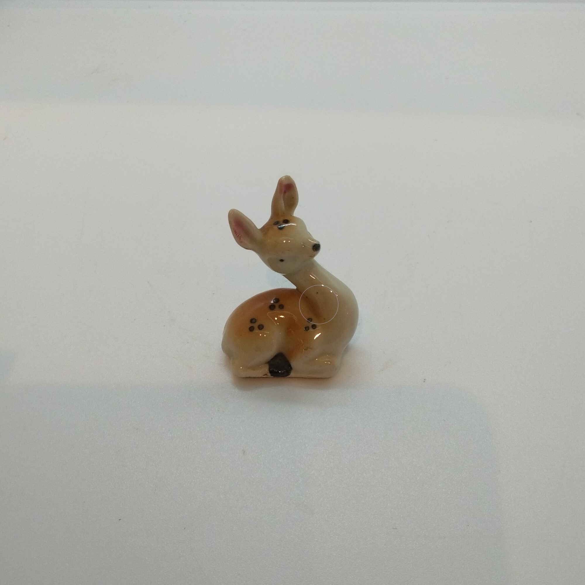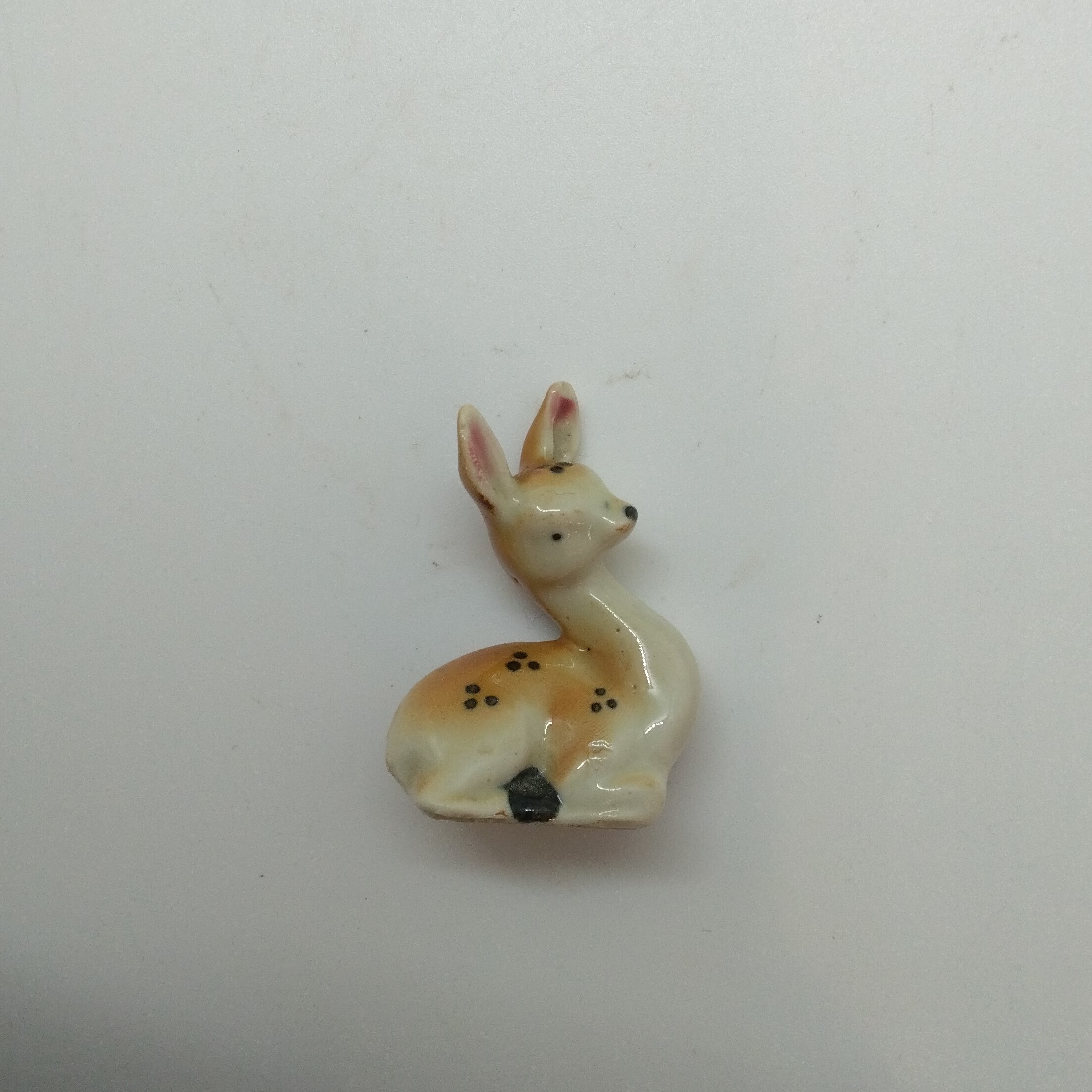 Liten (3,5*4 cm) porslinsfigurin av liggande rådjurskid, felfri.