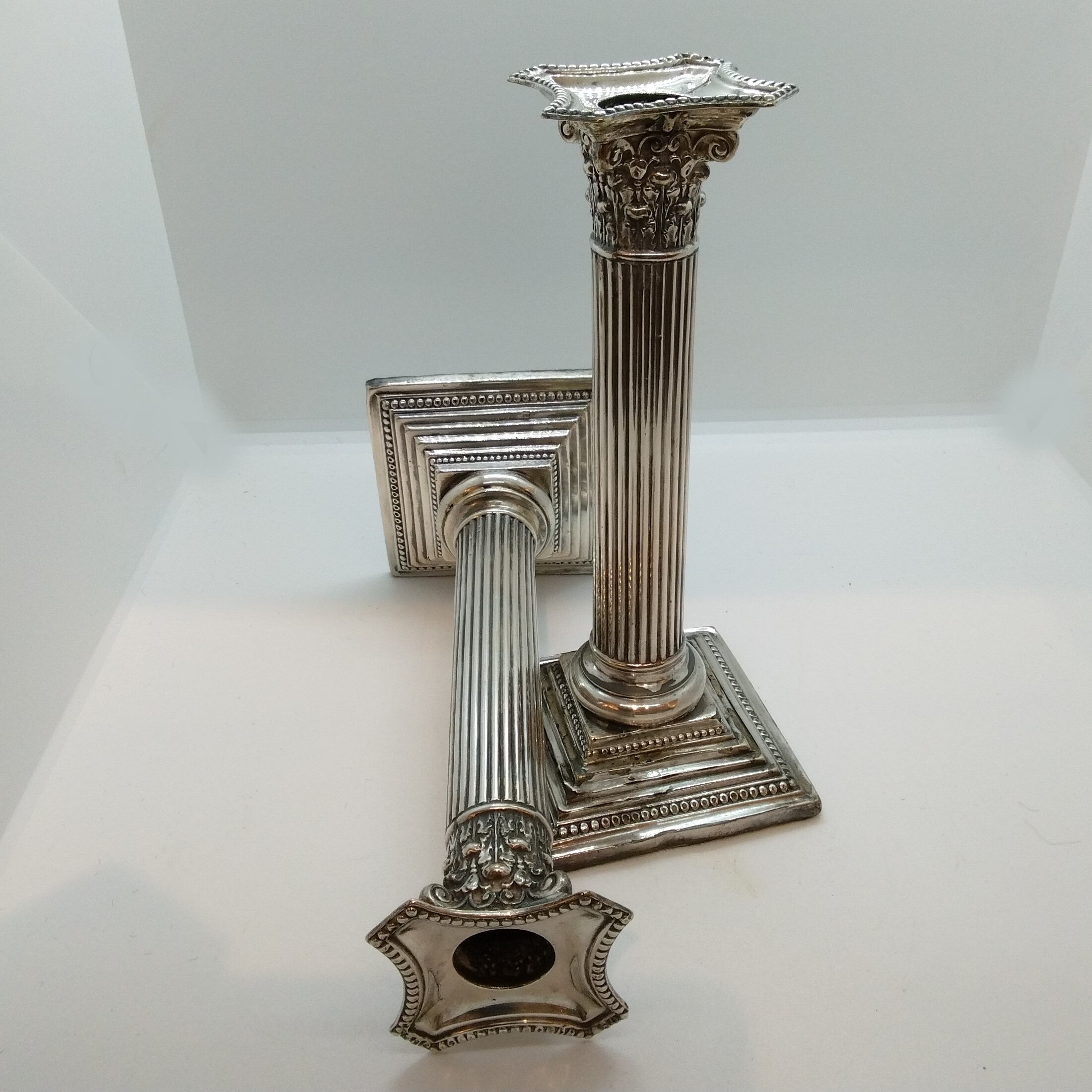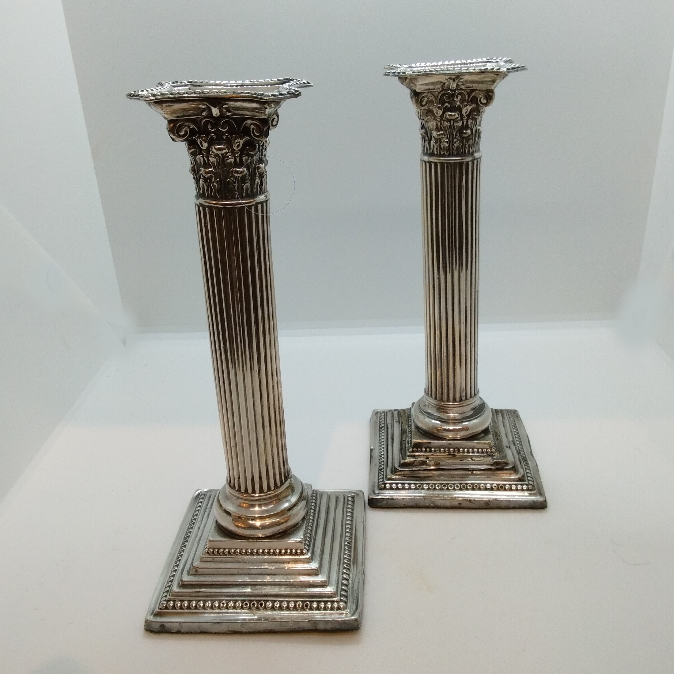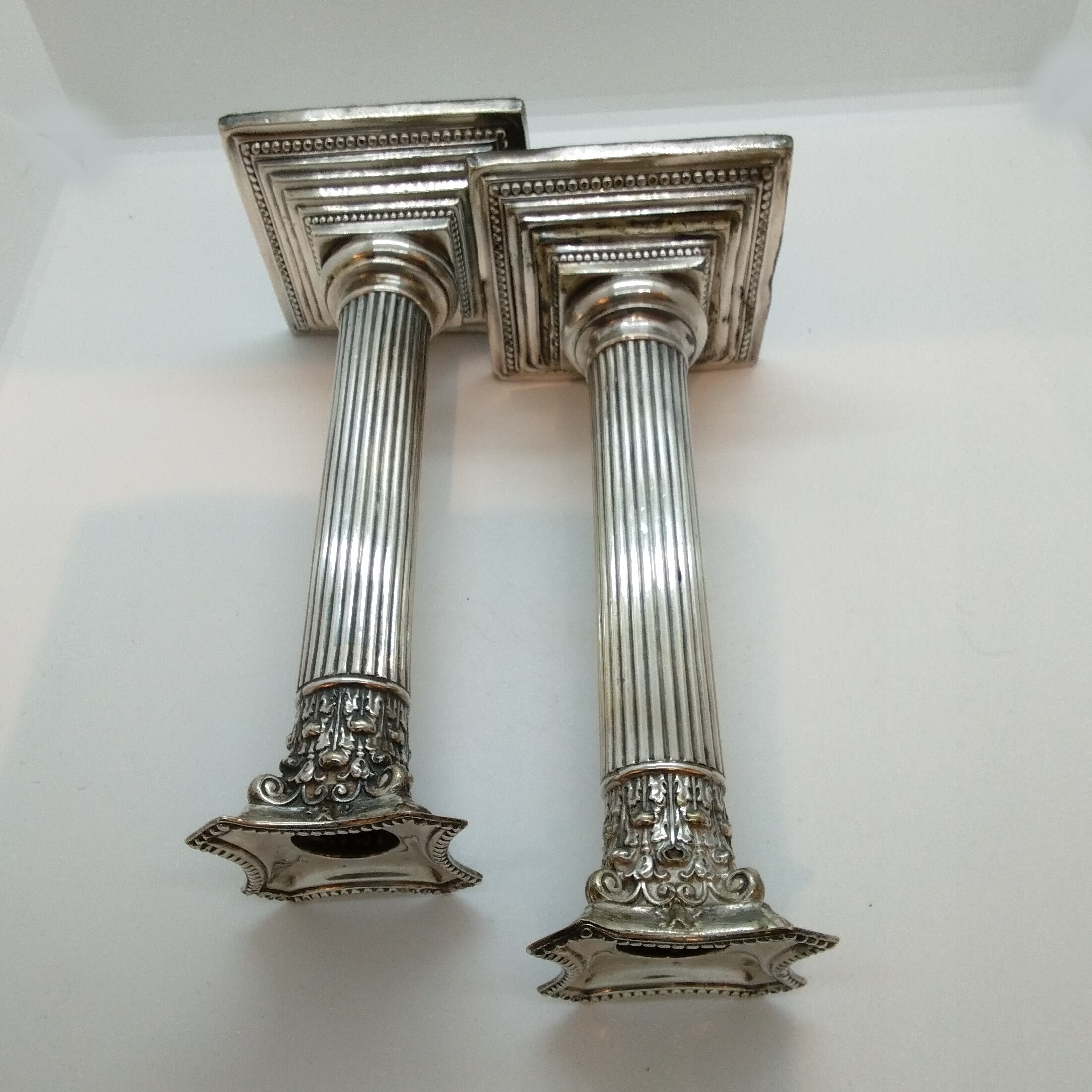 Kolonnljusstakar i silver, viktorianska England, Birmingham Henry Fowler (1896-1905), höjd ca 21 cm, hårt putsade.