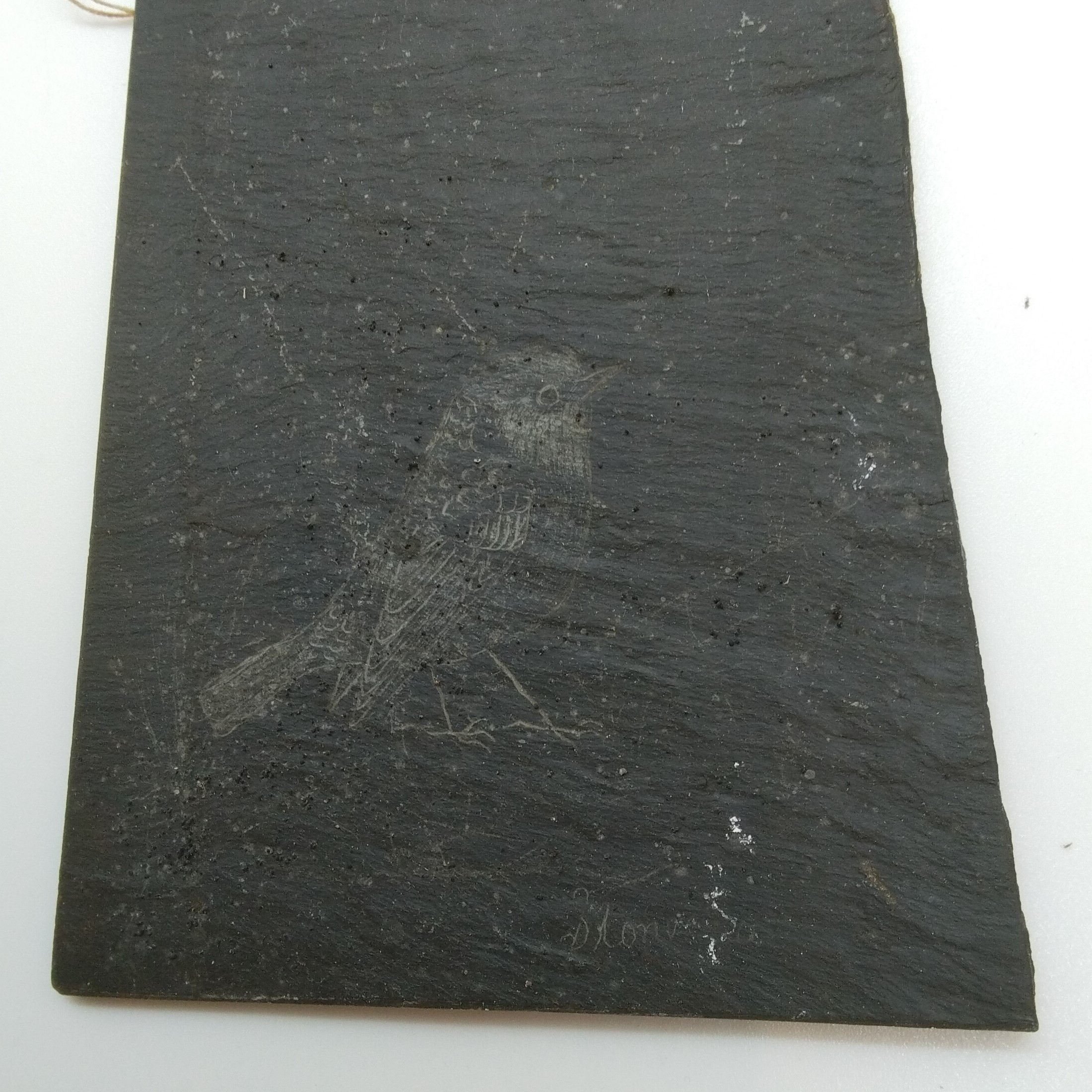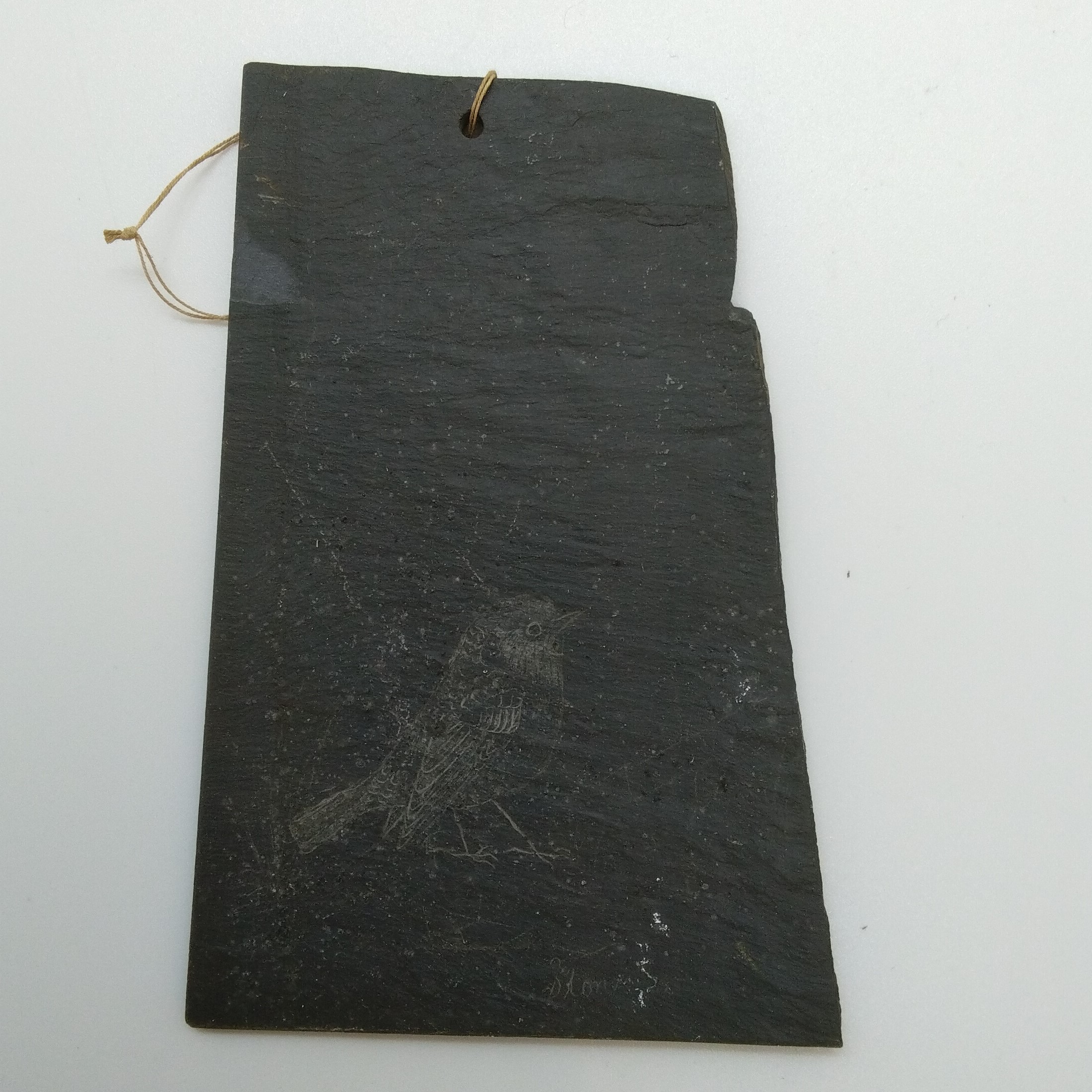 Liten skifferplatta med fågelristning. Mycket välgjord. Mått ca 14*9 cm. Märkt med konstnären namn som är svårt att tyda men det kan vara ”Stone” vilket hade varit ganska vitsigt!