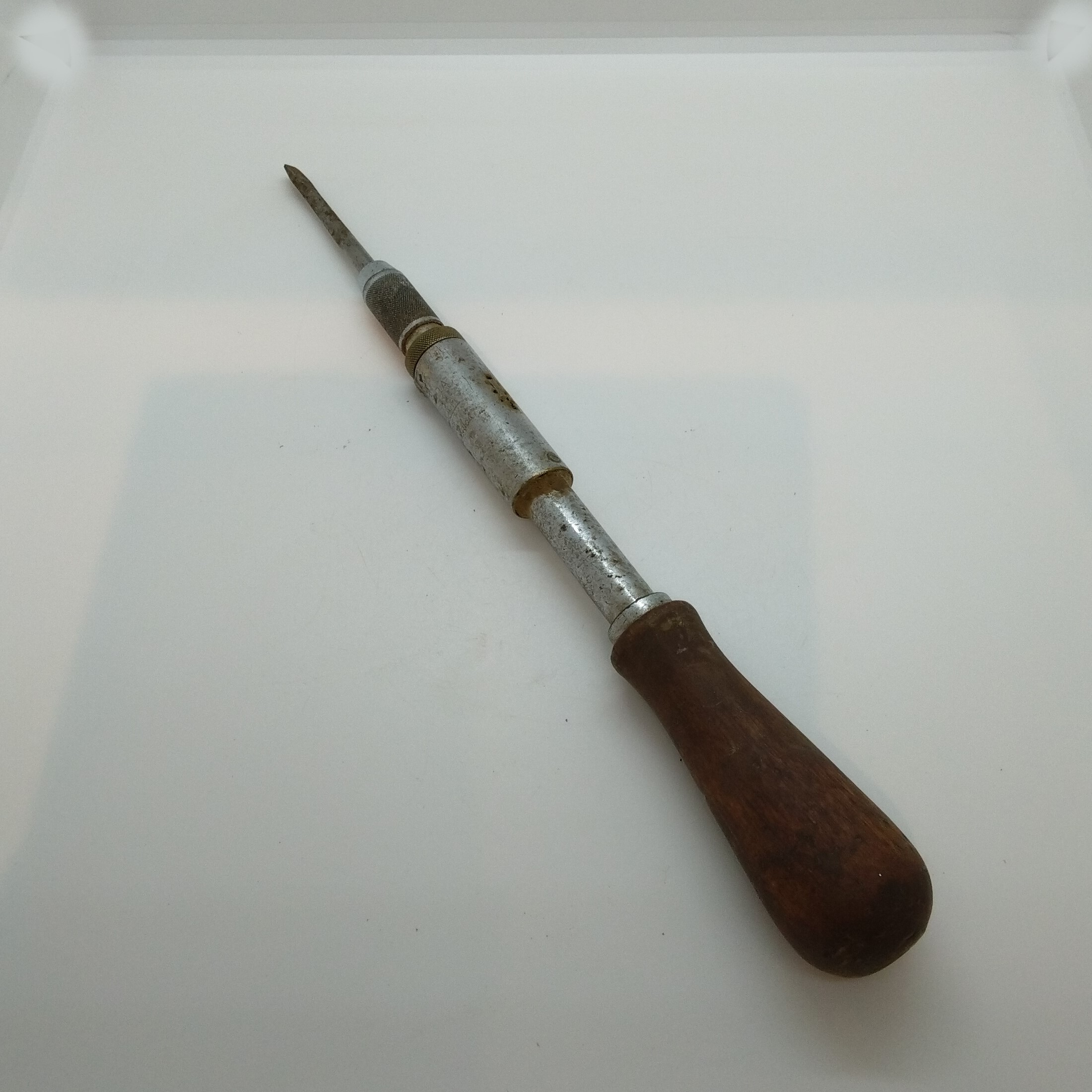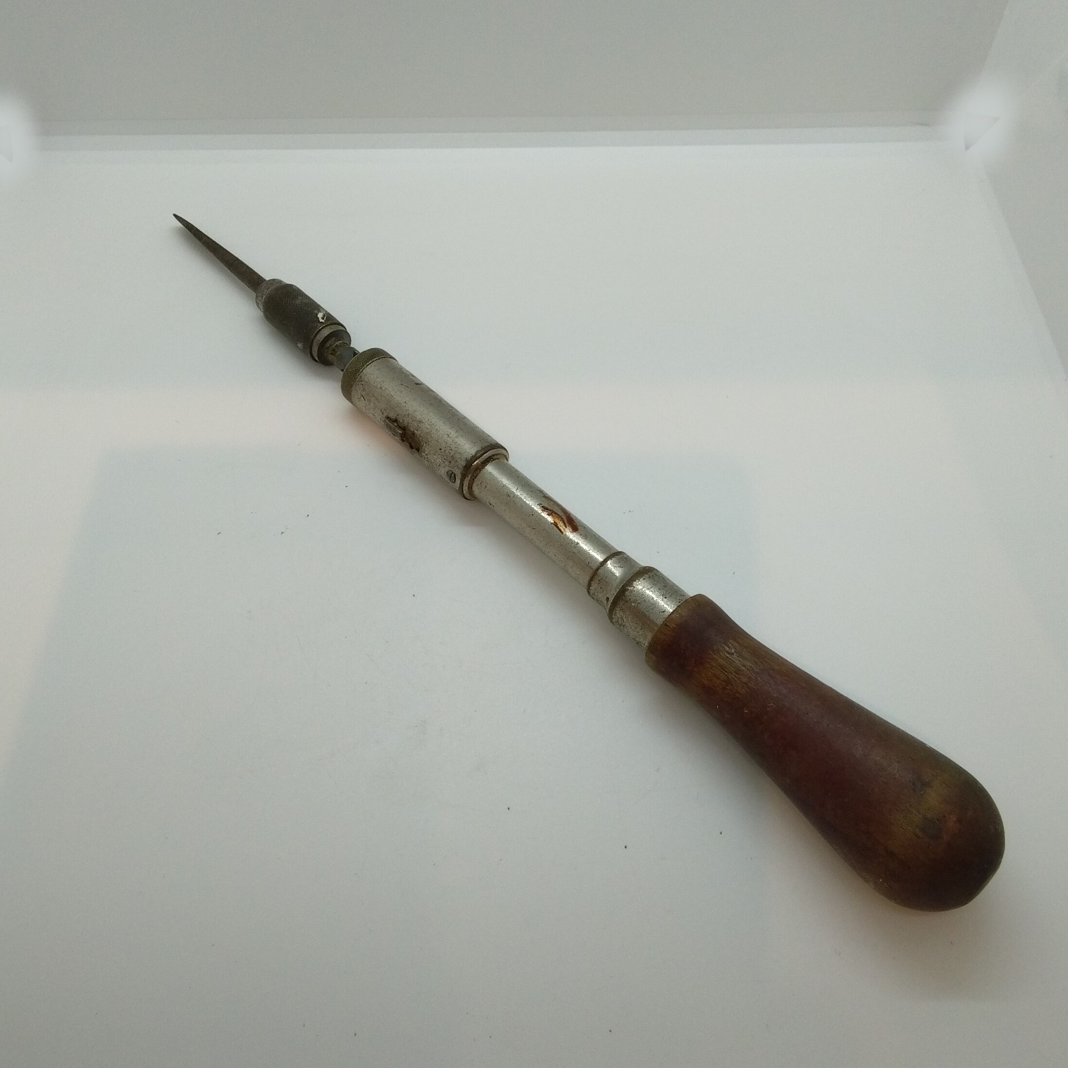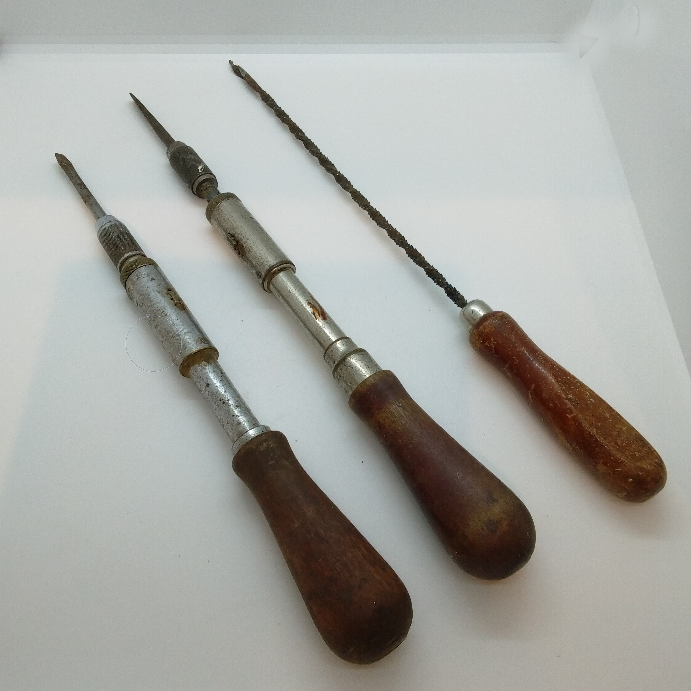 Två st spärrskruvmejslar, 6 mm och 8 mm, märkta YANKEE No 30. En st borr/skruv/rasp modell märkt North Brothers Manufactoring Co