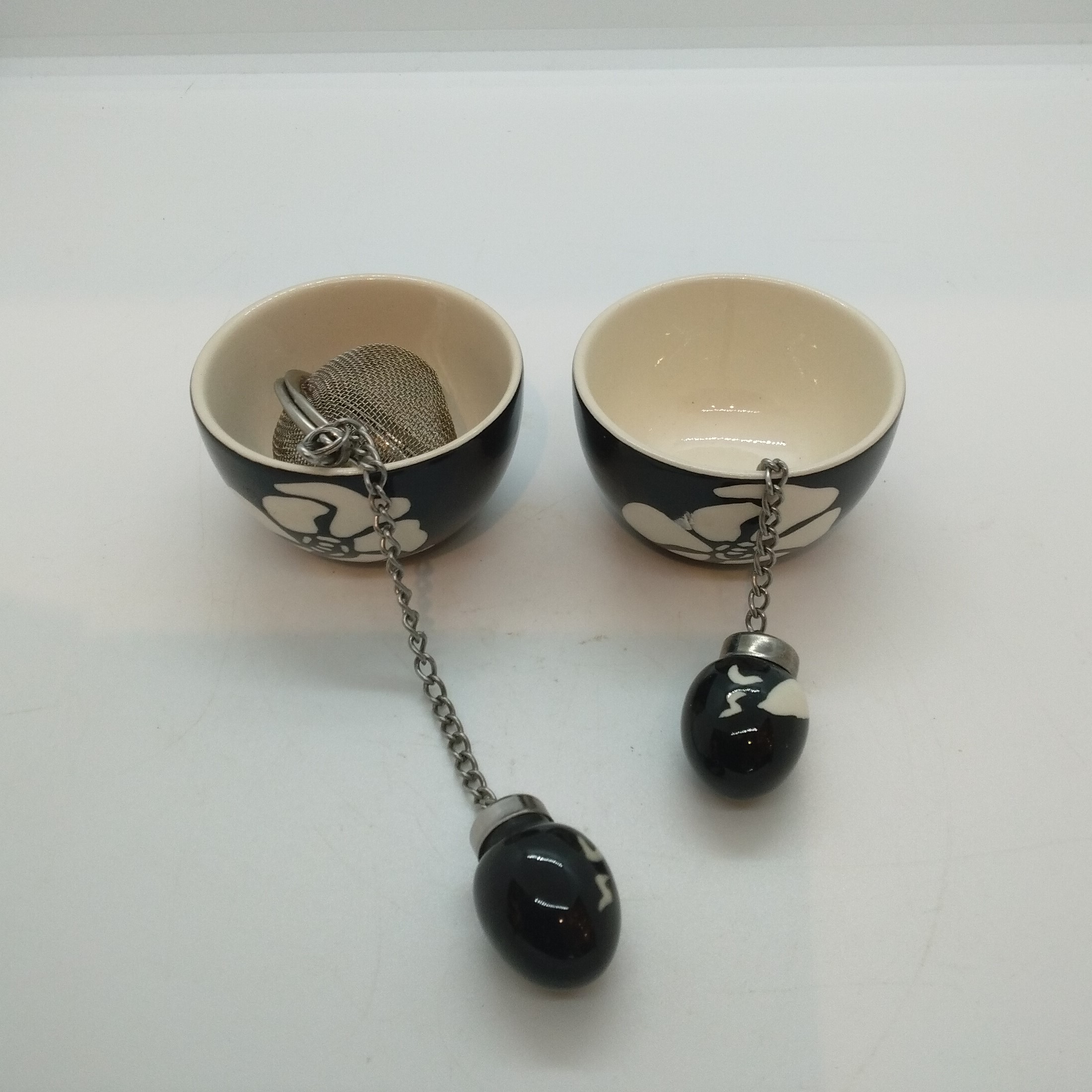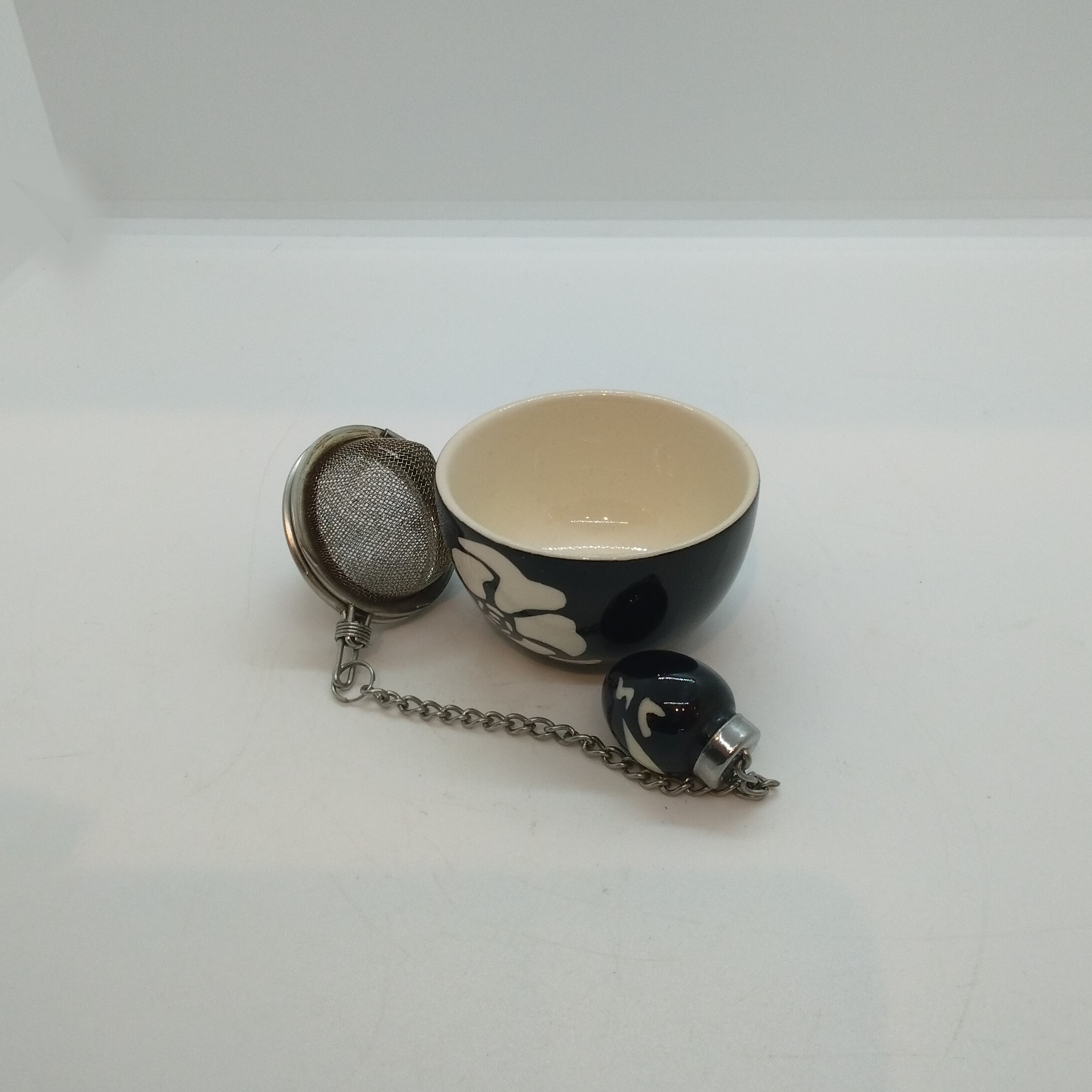 Två st små skålar för tesilen, tillhörande tesil med tyngd. En st sil saknas i övr u a, ø 6 cm, höjd 3,5 cm.