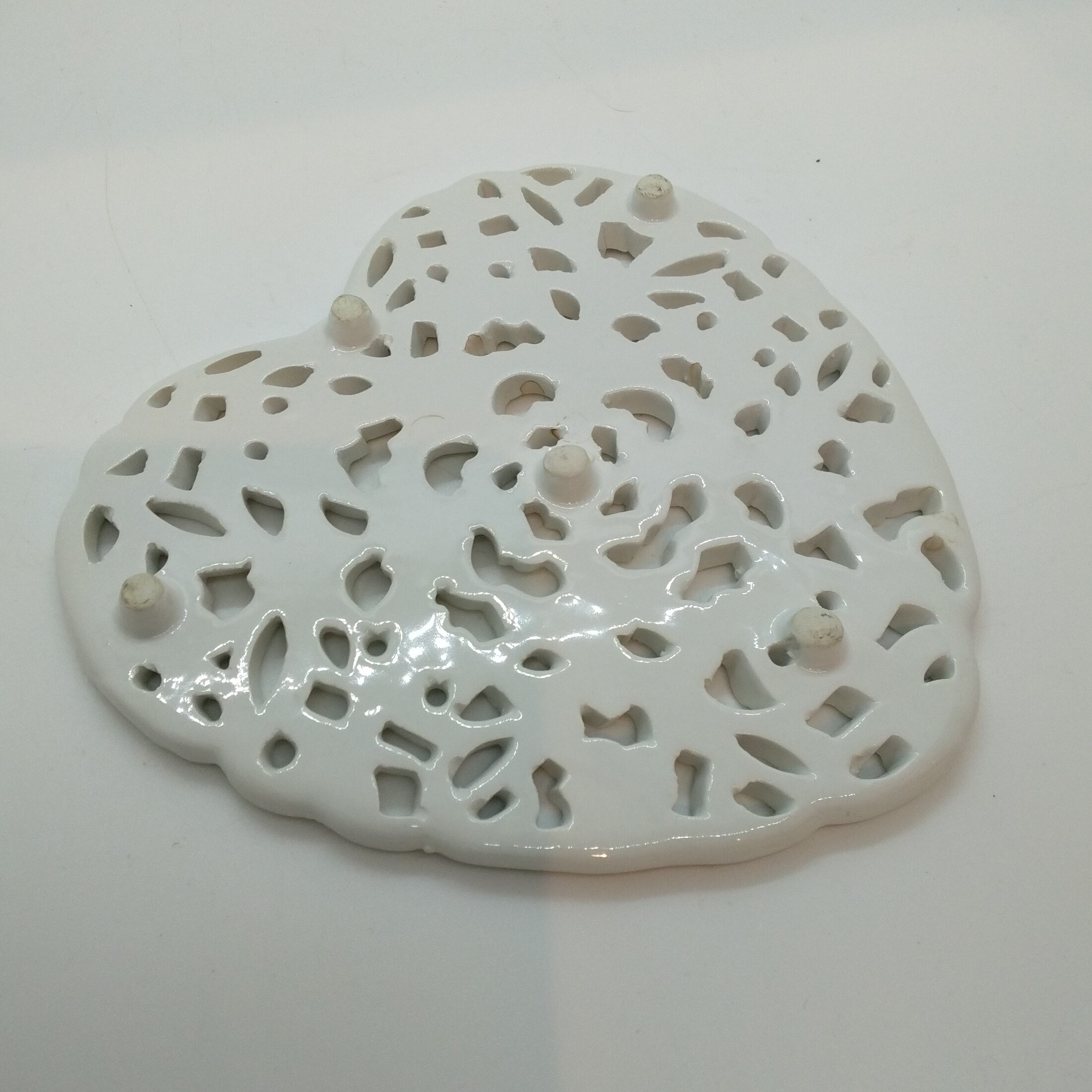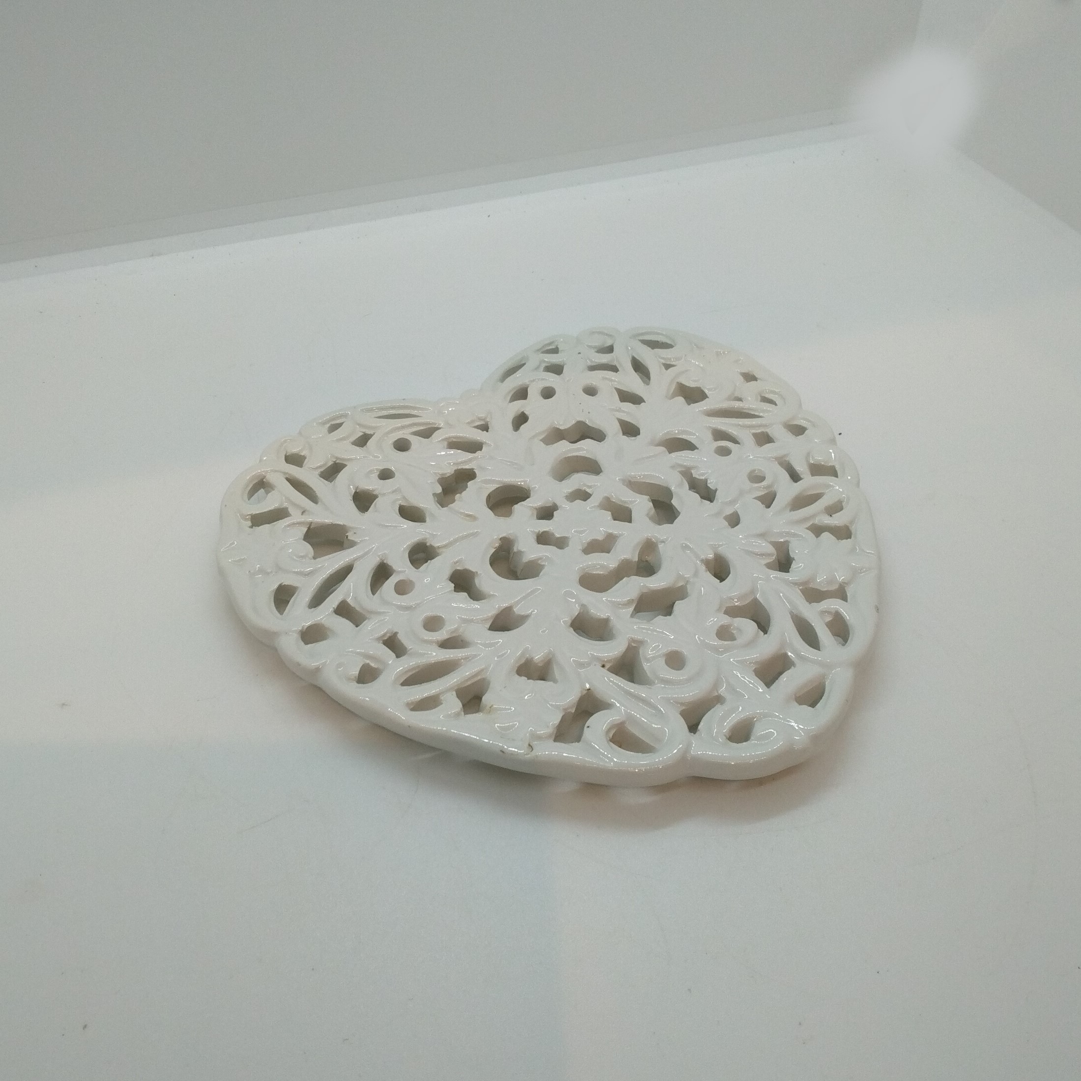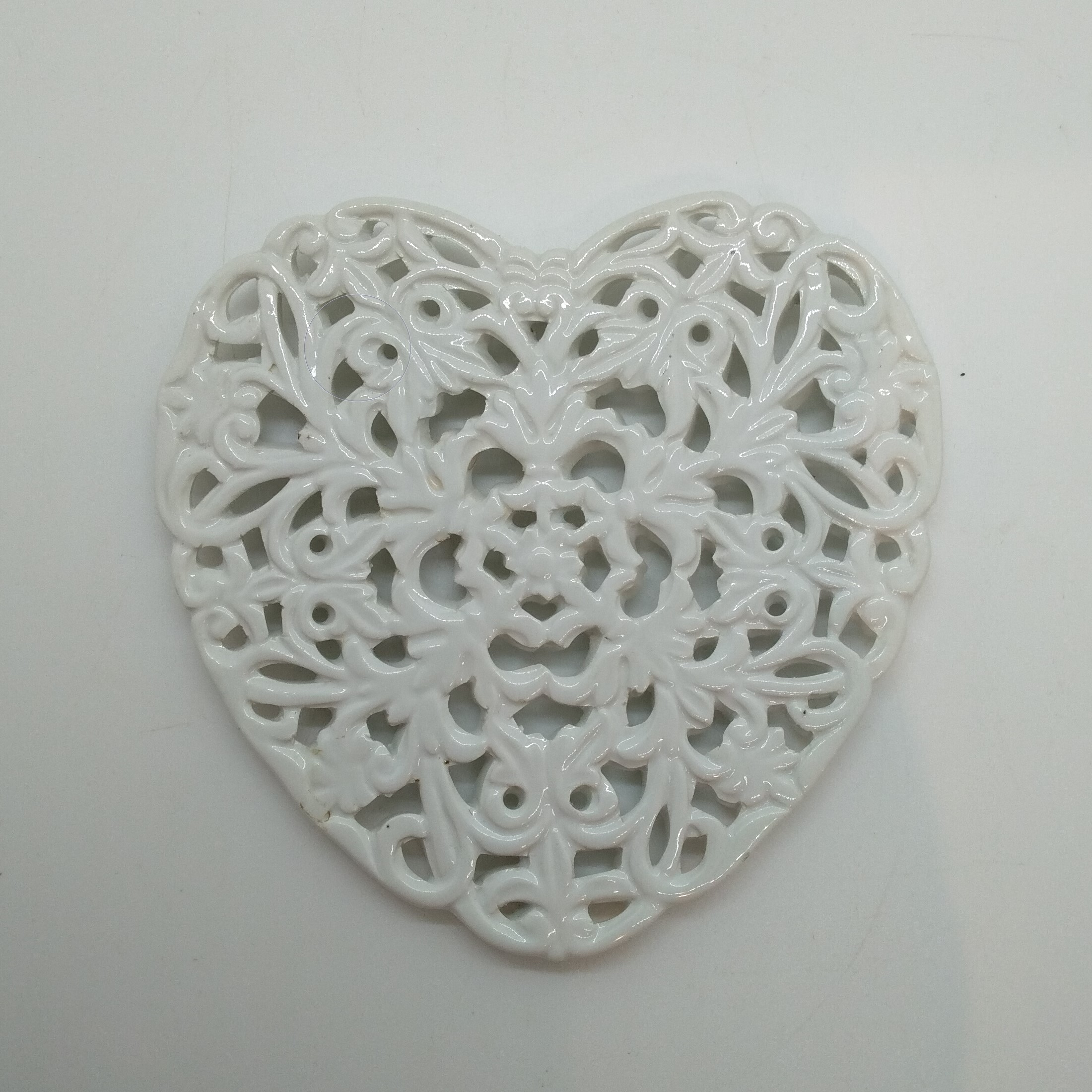 Hjärtformad, genombruten värmeplatta i porslin, mått ca 15*16 cm, felfri!